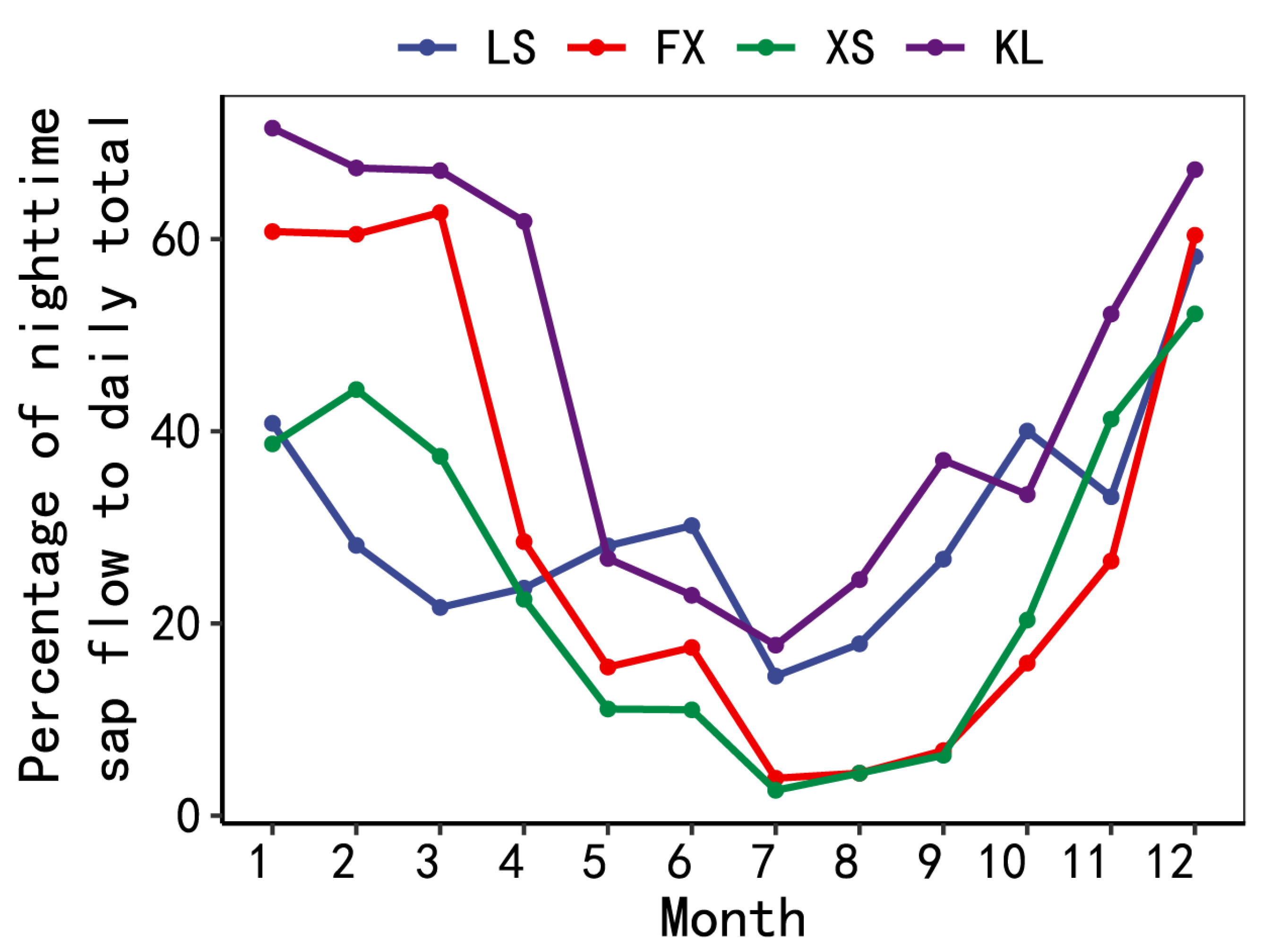 - Zhao, X.; Zhao, P.; Zhu, L. Differentiating refilling and transpiration from night-time sap flux based on time series modelling. Trees 2022, 36, 1621–1632. [Google Scholar] [CrossRef]