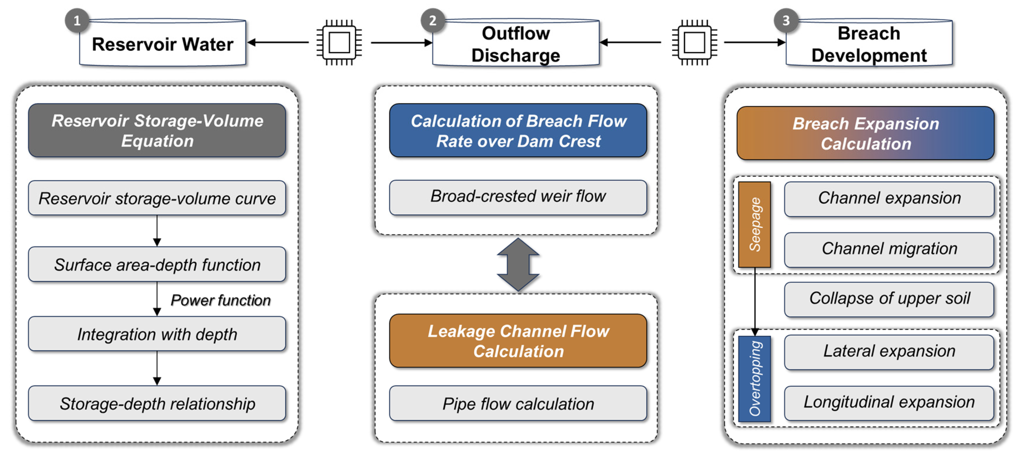 The combined action of channel widening and breach incision undermines the stability of the overburden material. This weakening is governed by the reduction in effective stress due to increased pore water pressure, which leads to a functional decrease in soil shear strength (dependent on cohesion and the angle of internal friction). The extent of this effect depends on the spatial relationship between the breach and the seepage channels. If the soil above a seepage channel collapses due to stress imbalance, the failure mode may shift from a combined seepage-overtopping mechanism to one dominated by overtopping alone. Specifically, this collapse is triggered when the gravitational and seepage forces exceed the resisting shear strength of the soil arch (i.e., when the factor of safety drops below a critical threshold). This mechanism elucidates that breaching is a complex dynamic process driven by the interaction of surface flow, seepage, sediment transport, and slope instability, phenomena that are fully integrated into the proposed modeling approach. Based on this, this study establishes a comprehensive multi-module coupled numerical framework designed to simulate the dam failure process. The core framework consists of three main computational modules, as illustrated in