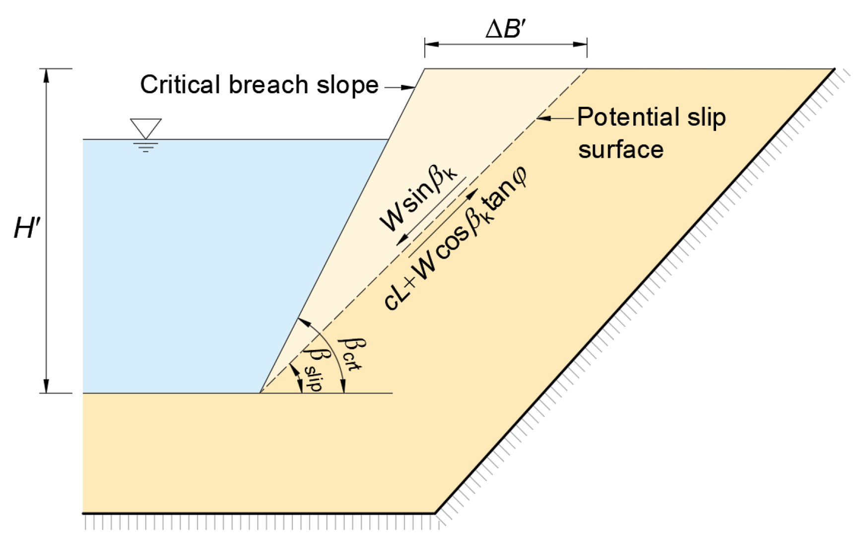 Qo, the evolving breach cross-section is typically idealized as a trapezoidal or rectangular profile. As substantiated by findings from large-scale flume experiments [