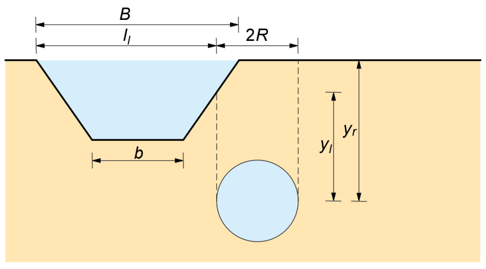 Step 12: Calculate the soil thicknesses yl and yr above the seepage channel on both sides, based on the longitudinal trapezoidal profile of the dam (as defined in Equation (26)). This accounts for the variation in soil depth along the flow direction.