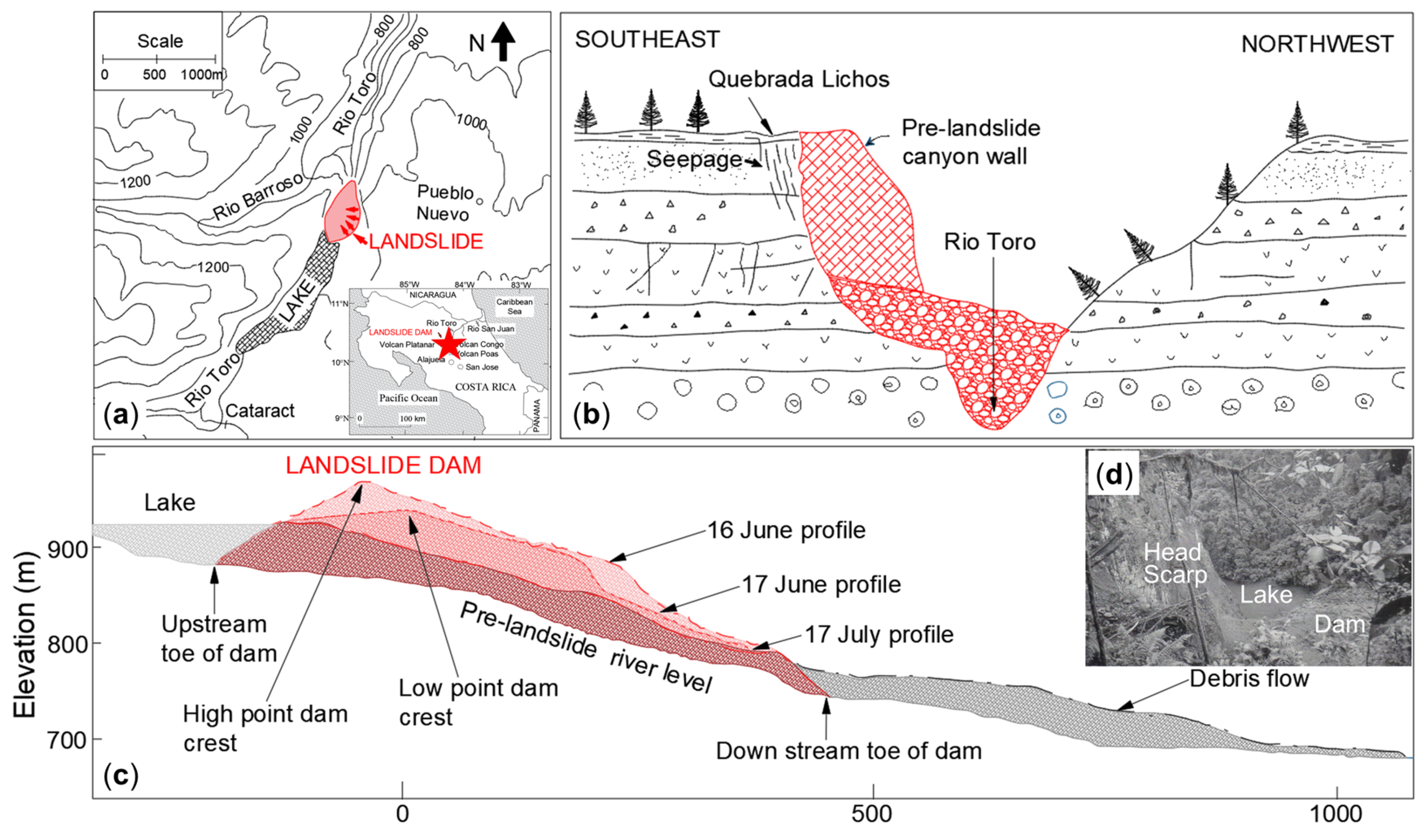 The landslide dam on the Rio Toro was about 75 m long (cross-canyon dimension) and 600 m wide (parallel to the axis of the canyon); its height was nearly 100 m on the right side of the canyon and tapered to 70 m where the toe of the slide abutted the left canyon wall. The lake impounded by the blockage attained a maximum length of 1200 m. The maximum elevation of lake level (after 3 days of filling) was estimated to be 936 m, giving a maximum lake depth of 52 m. Based on these dimensions, maximum lake volume was estimated at nearly 500,000 m3. One month later, on 13 July, heavy rainfall generated floodwater that passed through the dam, initiating extensive internal piping and ultimately triggering collapse of the dam body. This case represents a seepage-dominant collapse, where the primary mechanism driving the collapse is the infiltration of water into the soil, weakening its shear strength.