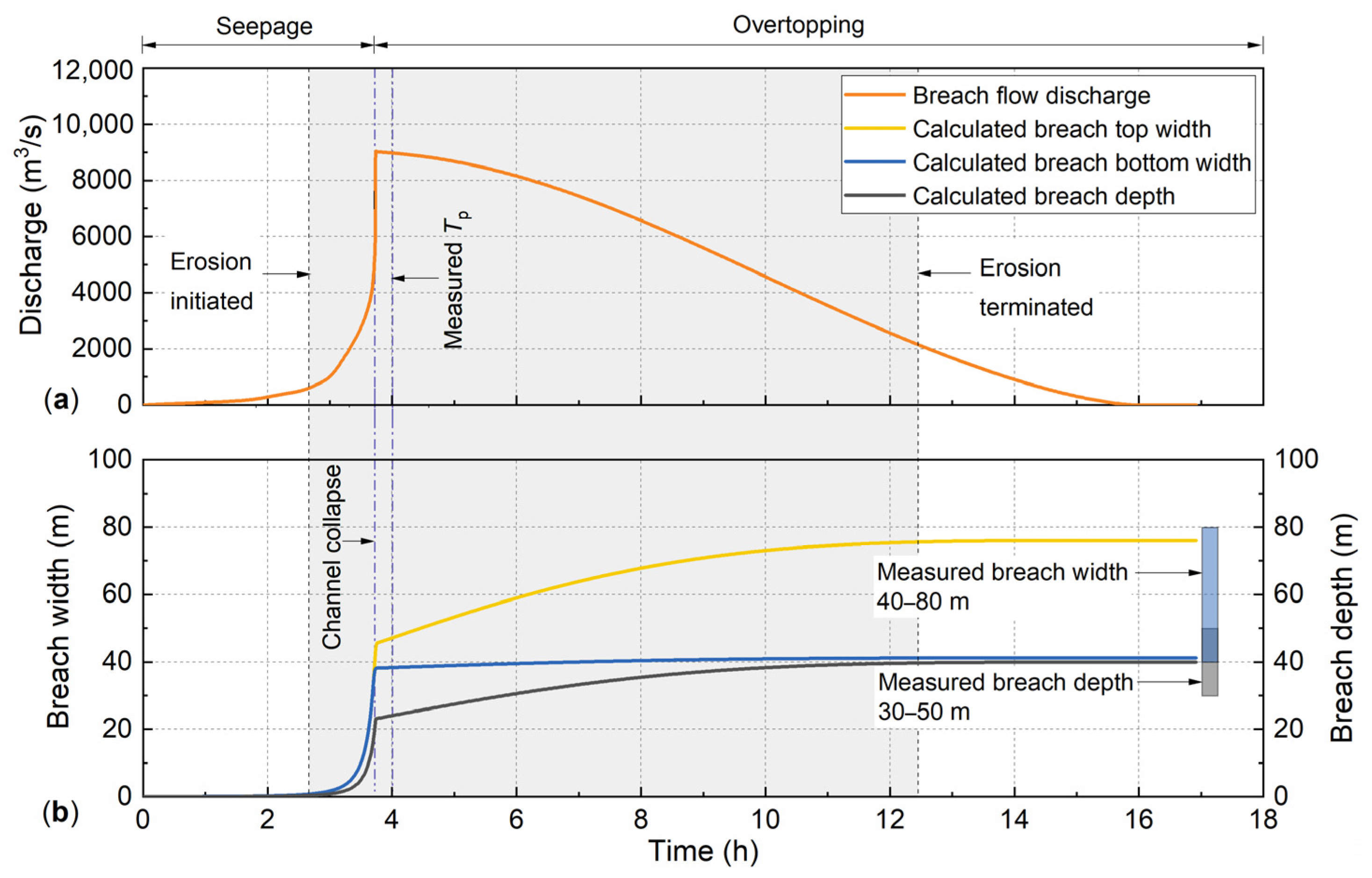 Figure 11. Based on the simulation results, key breach parameters were first validated against field measurements. For the breach discharge process, while the peak timing is documented in the literature, the calculated discharge peak occurs slightly earlier than observed. Additionally, in the present case, the timing of the peak discharge is perfectly synchronized with the collapse of the overlying soil layer within the seepage channel. This indicates that the breach discharge peaks at the moment the upper soil layer collapses, after which both the breach head and discharge gradually decrease. Regarding the final breach dimensions, the breach formed after the dam failure is irregular, and the literature provides a general range for the breach width. The calculated values for both the top and bottom widths of the breach fall within this observed range, and the computed breach depth also aligns with the measured results.