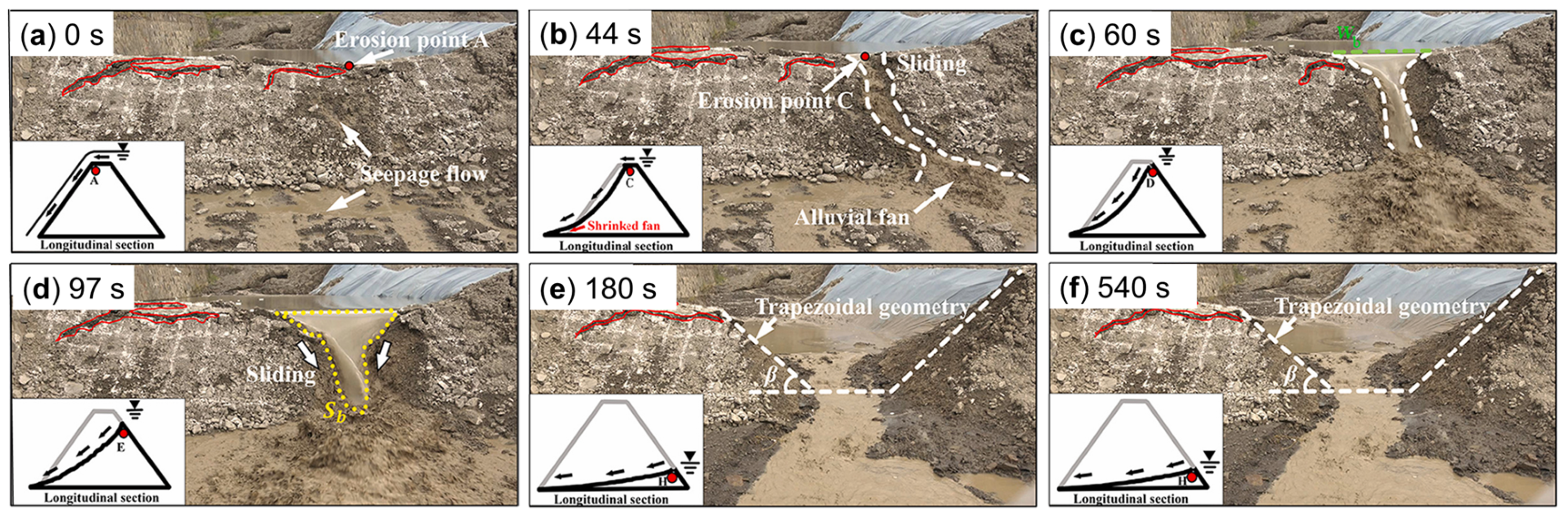 42] have shown that before combined erosion begins, initial penetrating seepage channels often form inside the dam. However, since the seepage discharge is usually limited, the reservoir water level continues to rise provided that the inflow exceeds the seepage outflow. Once the impounded water level surpasses the minimum elevation of the dam crest, overtopping occurs. The overtopping flow scours the dam body, leading to the simultaneous vertical incision and lateral widening of the breach channel. At the same time, some reservoir water seeps through internal channels toward the downstream side, carrying fine soil particles along the way. This particle movement leads to the gradual enlargement of the seepage channels.