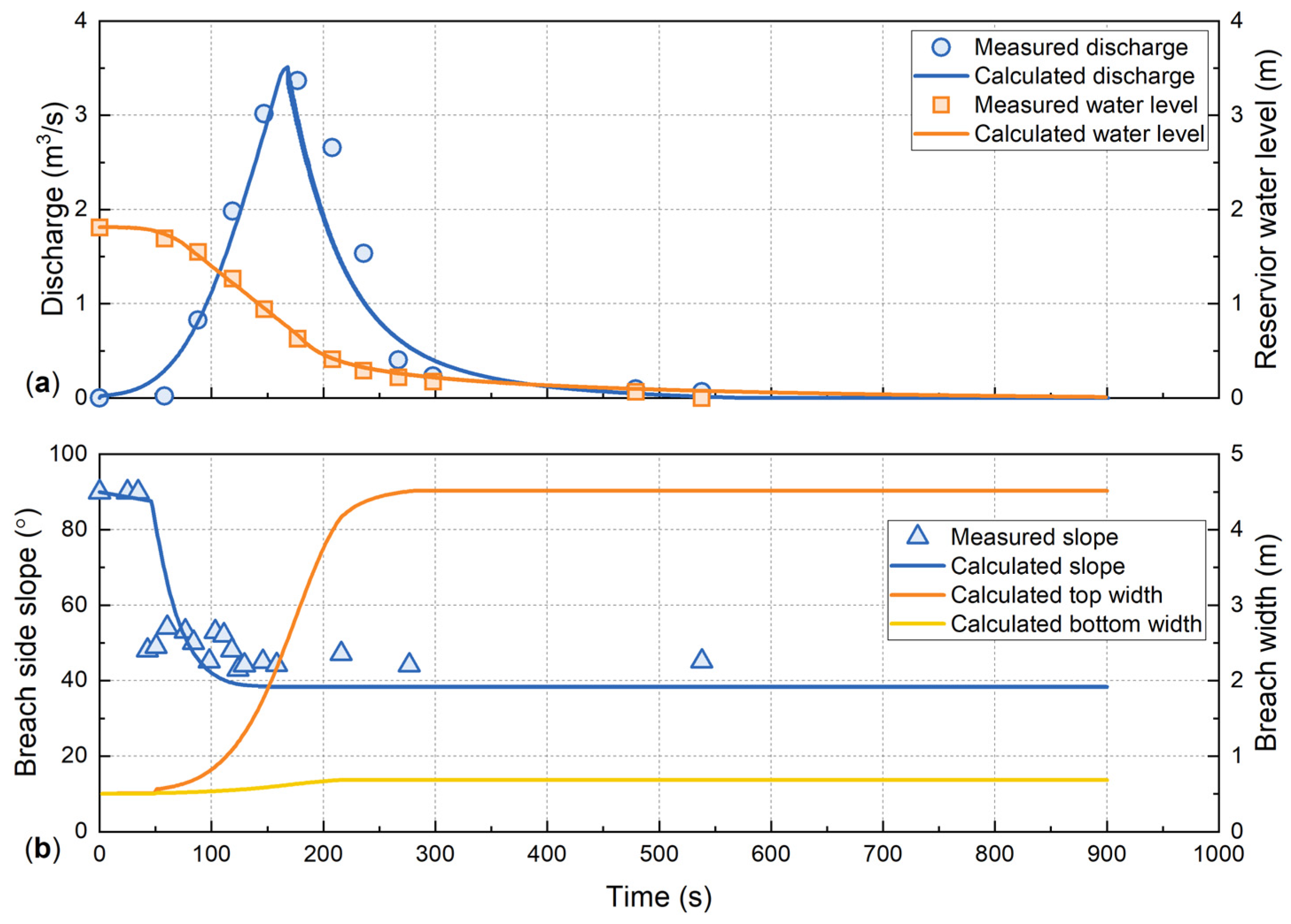 βf, which was 15.3% smaller than the measured value. This discrepancy is primarily attributed to the fact that the model simulates the breaching process of a landslide dam under combined erosion (overtopping and seepage). The presence of seepage channels or zones within the dam leads to internal saturation, creating significant differences in soil properties between saturated and unsaturated regions. In particular, both cohesion and the internal friction angle, which are critical for erosion resistance and shear strength, vary considerably. To account for this, the model used conservatively low estimates of these parameters as input, resulting in a faster erosion rate, earlier peak discharge time, quicker reservoir drawdown, and ultimately a gentler final breach slope angle. This limitation underscores the complexity of the coupled failure mechanism and highlights a critical direction for future model refinement: specifically, incorporating the dynamic evolution of soil mechanical properties in response to the transient seepage field to better capture the progressive weakening process. This also highlights an area where the model requires further refinement.