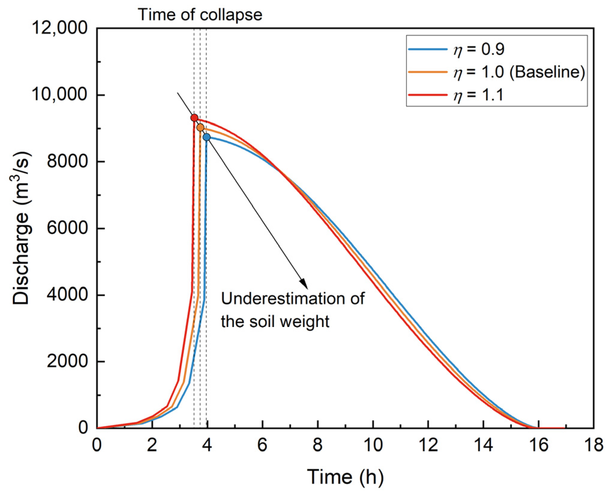 η = 1.1 accelerates the satisfaction of the failure criterion, resulting in an earlier onset of the collapse and a leftward shift in the hydrograph. Conversely, a decrease in weight