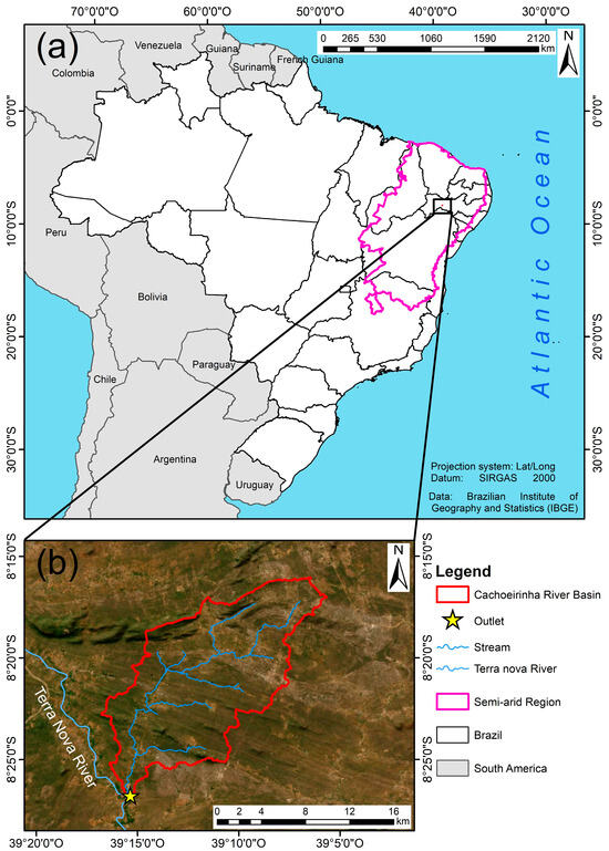 (a) Location of the Cachoeirinha River basin in semi-arid region, Pernambuco State (PE) of Brazil, (b) outlet and streamflow. Souce: Adapted from [30].
