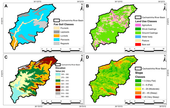 Maps of soil type (A), land use (B), elevation (C), and slope (D) of the Cachoeirinha watershed.