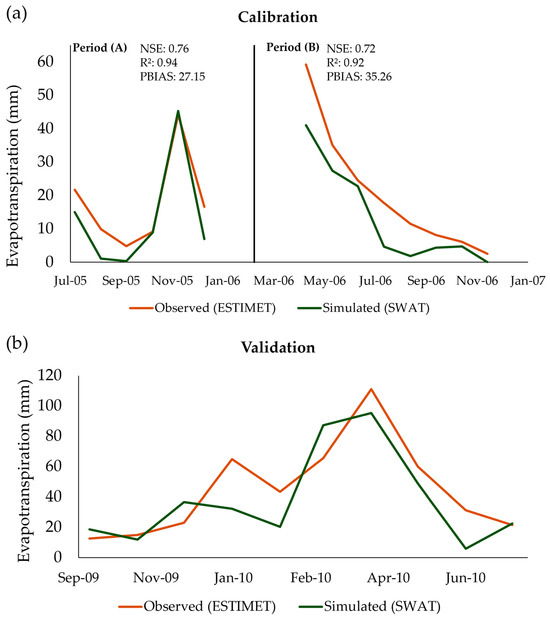 Statistical results of the calibration (a) and validation (b) of SWAT-simulated and ESTIMET model for evapotranspiration.
