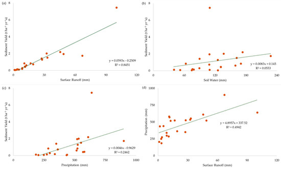 According to Daramola et al. [51] there is a strong and direct relationship between precipitation, surface runoff, and SY, with precipitation playing the main and most influential role. During rainy days, water flows over the Earth’s surface, exposing fragile soil and rocks to erosion processes, and resulting in a sediment load.