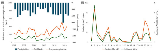 Annual time series of simulated soil water and actual evapotranspiration (a) and surface runoff and sediment yield (b) in the Cachoeirinha Basin from 2003 to 2023.
