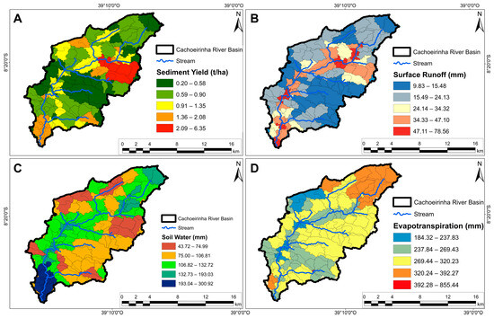 Sediment yield (t ha−1 yr−1a) (A), surface runoff (mm) (B), soil water (mm) (C), and evapotranspiration (mm) (D) of the Cachoeirinha watershed.