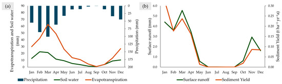 (a) Monthly distribution of evapotranspiration, soil water, and precipitation (mm); (b) Monthly distribution of surface runoff (mm) and sediment yield (t ha−1 yr−1a). Monthly variation in precipitation, evapotranspiration, surface runoff, soil water, and sediment yield simulated by the SWAT model.