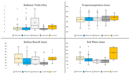 Figure 11 presents the boxplot of hydrological variables by soil type. Surface runoff showed partially heterogeneous behavior among the soil classes, generally ranging between 20.74 mm and 36.33 mm, with no major contrasts for most soils. The main exception was Leptosols, which recorded the lowest runoff (20.74 mm).