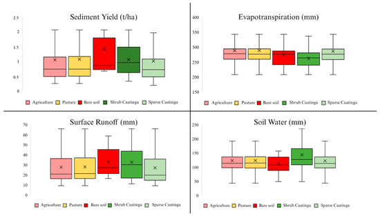Figure 12 shows the contribution of different LULC to SY, ET, surface runoff, and soil water. ET exhibited low variation among LULC, with the highest average in pasture (289.32 mm) and the lowest in arboreal caatinga (262.90 mm). Surface runoff was greatest in bare soil and shrub caatinga, with values of 33 mm and 32.82 mm, respectively, whereas the lowest runoff occurred in sparse caatinga (27.15 mm). Although annual soil water content varied minimally across LULC, shrub caatinga presented the highest average (143.68 mm), while exposed soil had the lowest (113.78 mm).