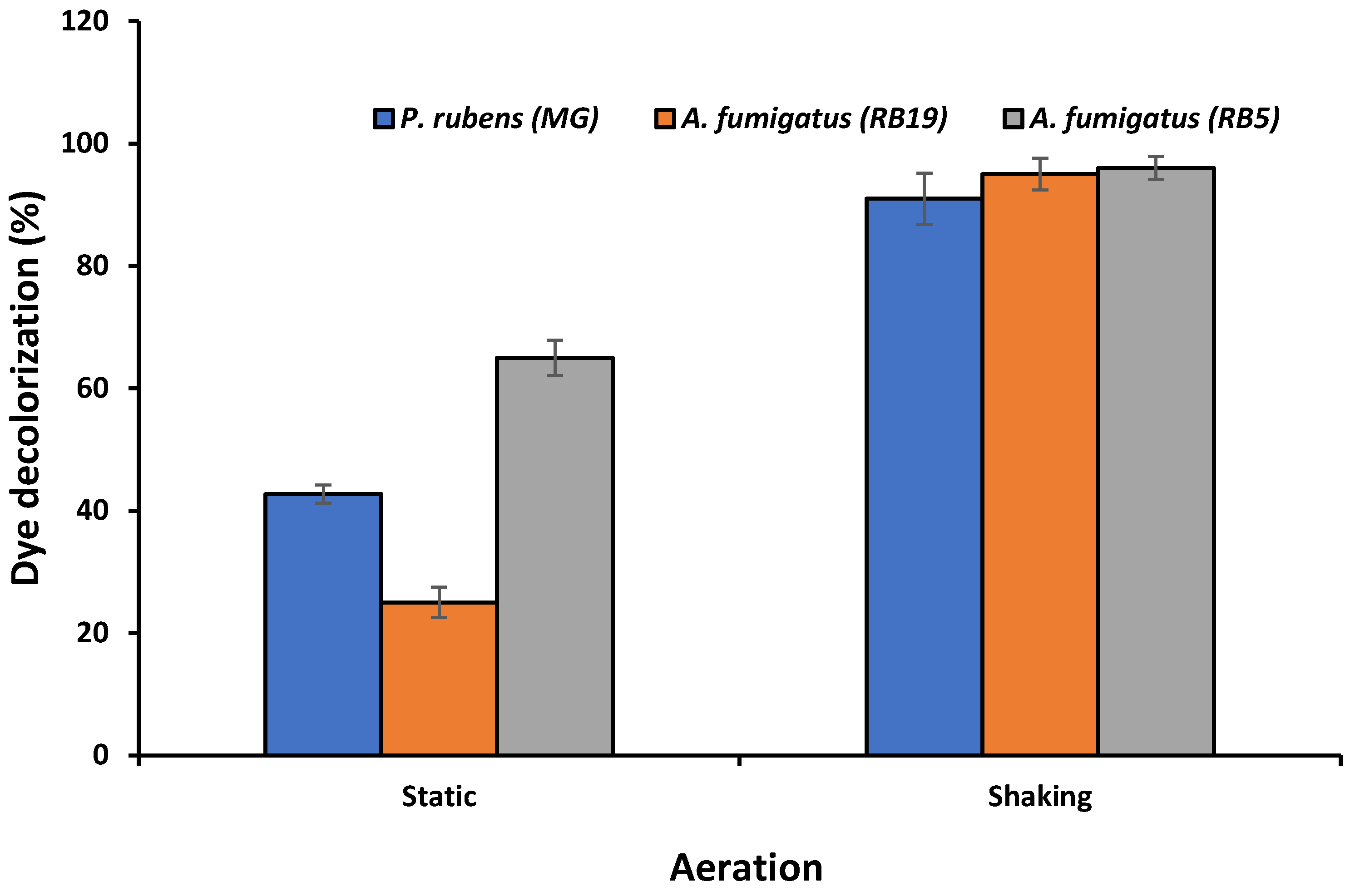 3.3.6. Effect of Shaking and Stationary Conditions on Dye Decolorization