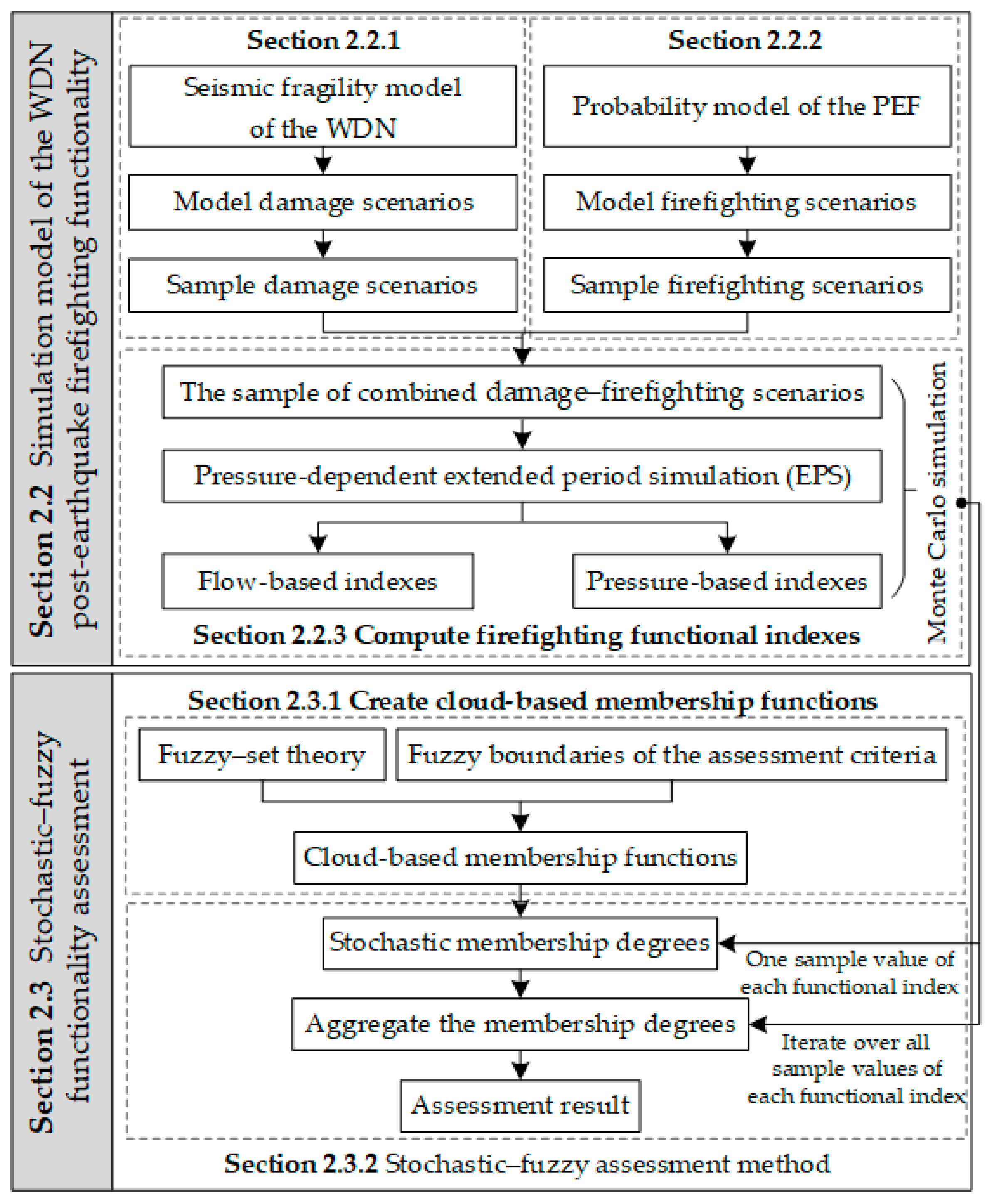 Chicago/Turabian StyleHe, Xiang, Hong Huang, Fengjiao Xu, Chao Zhang, and Tingxin Qin. 2026. "Stochastic–Fuzzy Assessment Framework for Firefighting Functionality of Urban Water Distribution Networks Against Post-Earthquake Fires" Sustainability 18, no. 2: 949. https://doi.org/10.3390/su18020949