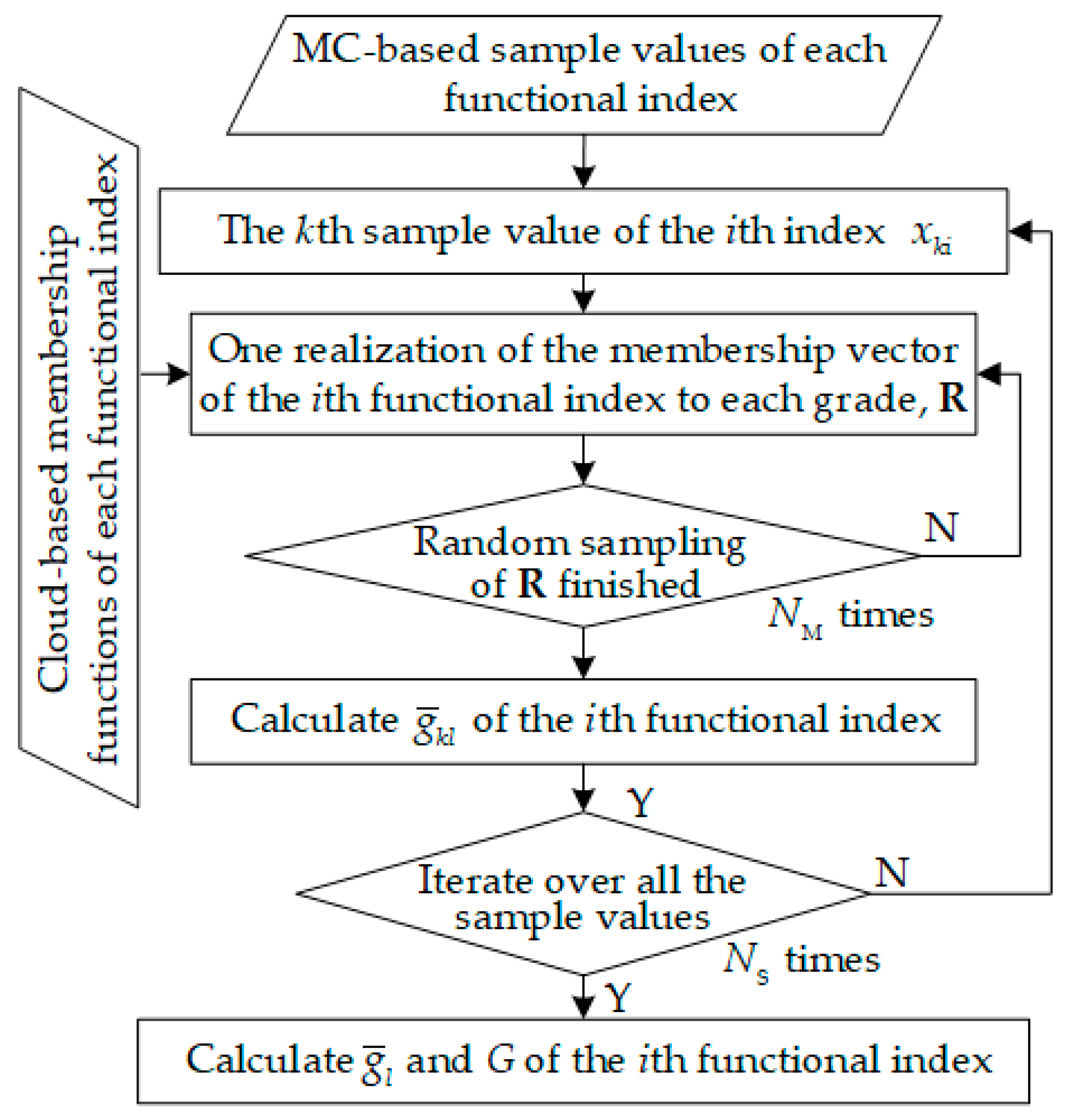 - The cloud model-based assessment method aligns the MC-based sample values of the functional indexes with qualitative assessment criteria with fuzzy boundaries. By overcoming the shortcomings of the mean MC-based values, the BCG algorithm, and fuzzy set theory, the proposed method can render the assessment result more reliable.