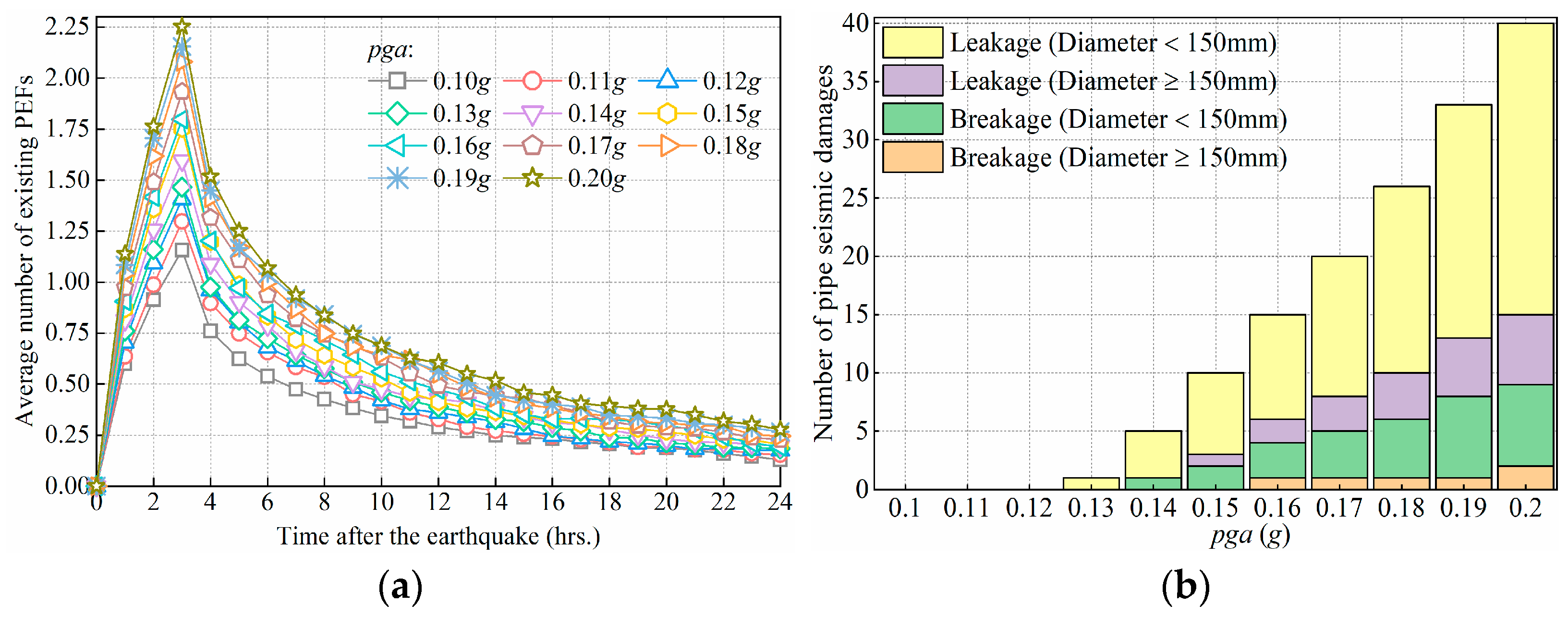 - Li, Y.Z.; Gao, J.L.; Zhang, H.Y.; Deng, L.Q.; Xin, P. Reliability assessment model of water distribution networks against fire following earthquake (FFE). Water 2019, 11, 2536. [Google Scholar] [CrossRef]