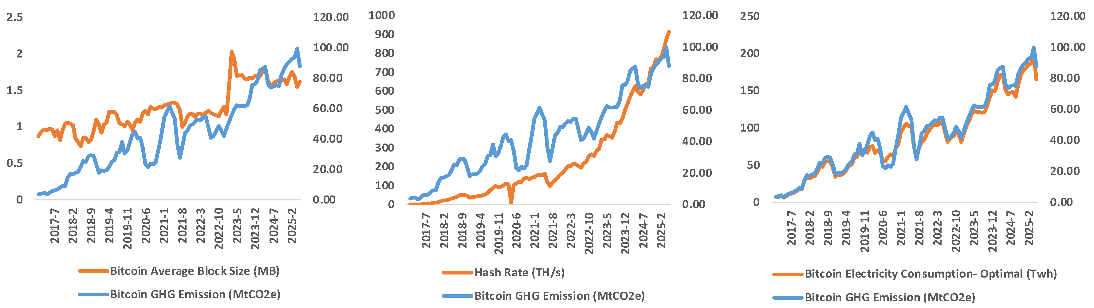 2 equivalent in May 2025—are used as the dependent variable to capture the environmental impact of cryptocurrency mining activities and to serve as a direct indicator of sustainability concerns. Bitcoin Average Block Size (measured in megabytes) is included to reflect changes in transaction volume and data load on the network, which may affect energy consumption per transaction. Bitcoin miners validate transactions by solving complex cryptographic problems known as hashes. Accordingly, the Hash Rate of Bitcoin (measured in terahashes per second, TH/s) represents the computational power devoted to mining activities and indicates the speed at which new transactions are added to the blockchain. Hash rate is a key determinant of electricity demand, as higher hash rates require greater computational intensity to mine a given number of blocks. Finally, Bitcoin Electricity Consumption (measured in terawatt-hours, TWh) is incorporated to quantify the overall energy intensity of the network. Electricity costs constitute the dominant share of Bitcoin mining expenditures, with estimates suggesting that energy expenses can account for as much as 90–95% of total mining costs. Consequently, lower electricity prices tend to increase mining profitability and incentivize higher mining activity. Taken together, these variables provide a comprehensive framework for assessing the sustainability implications of Bitcoin mining by explicitly linking technical network performance to environmental outcomes. As illustrated in