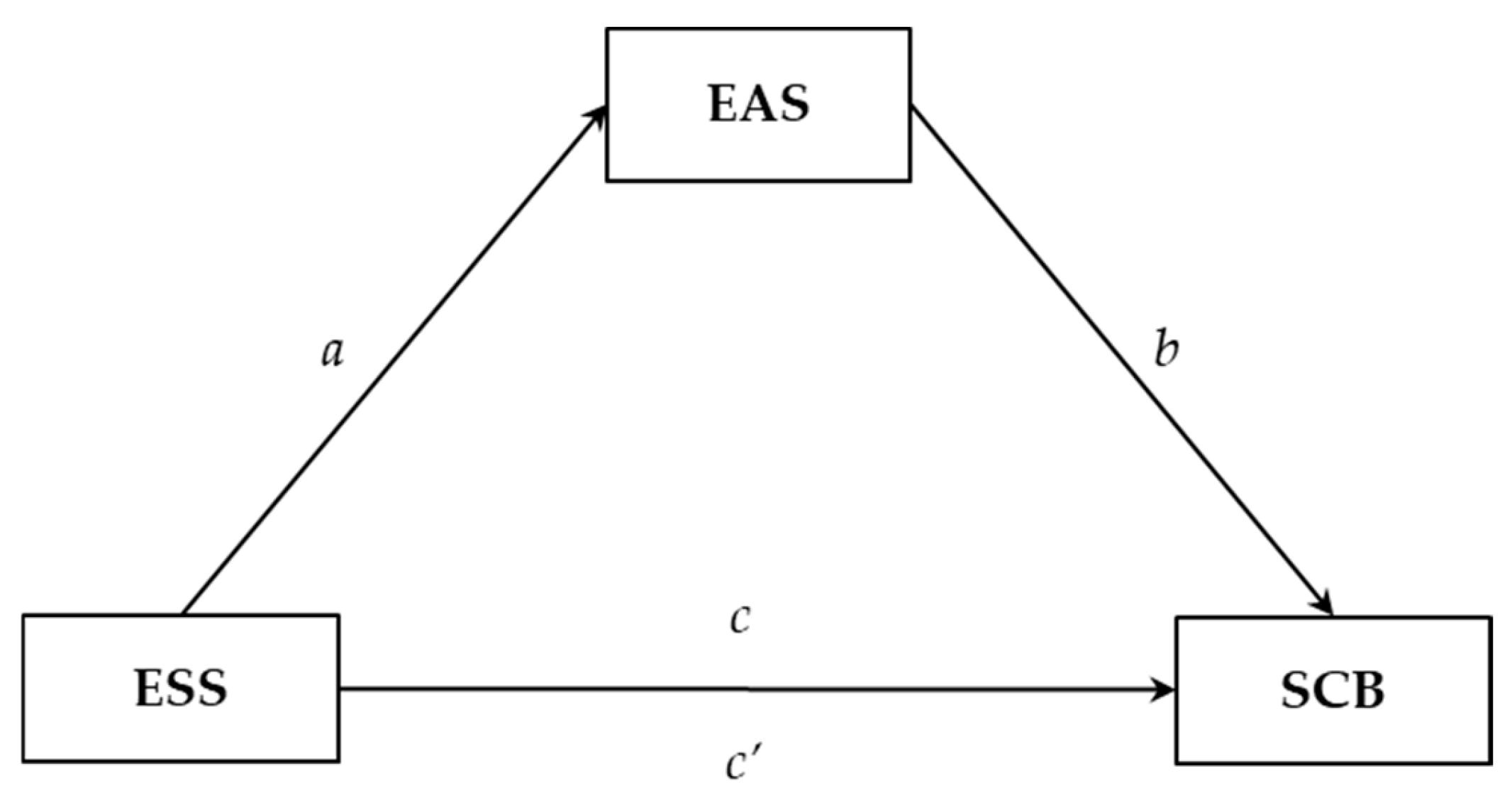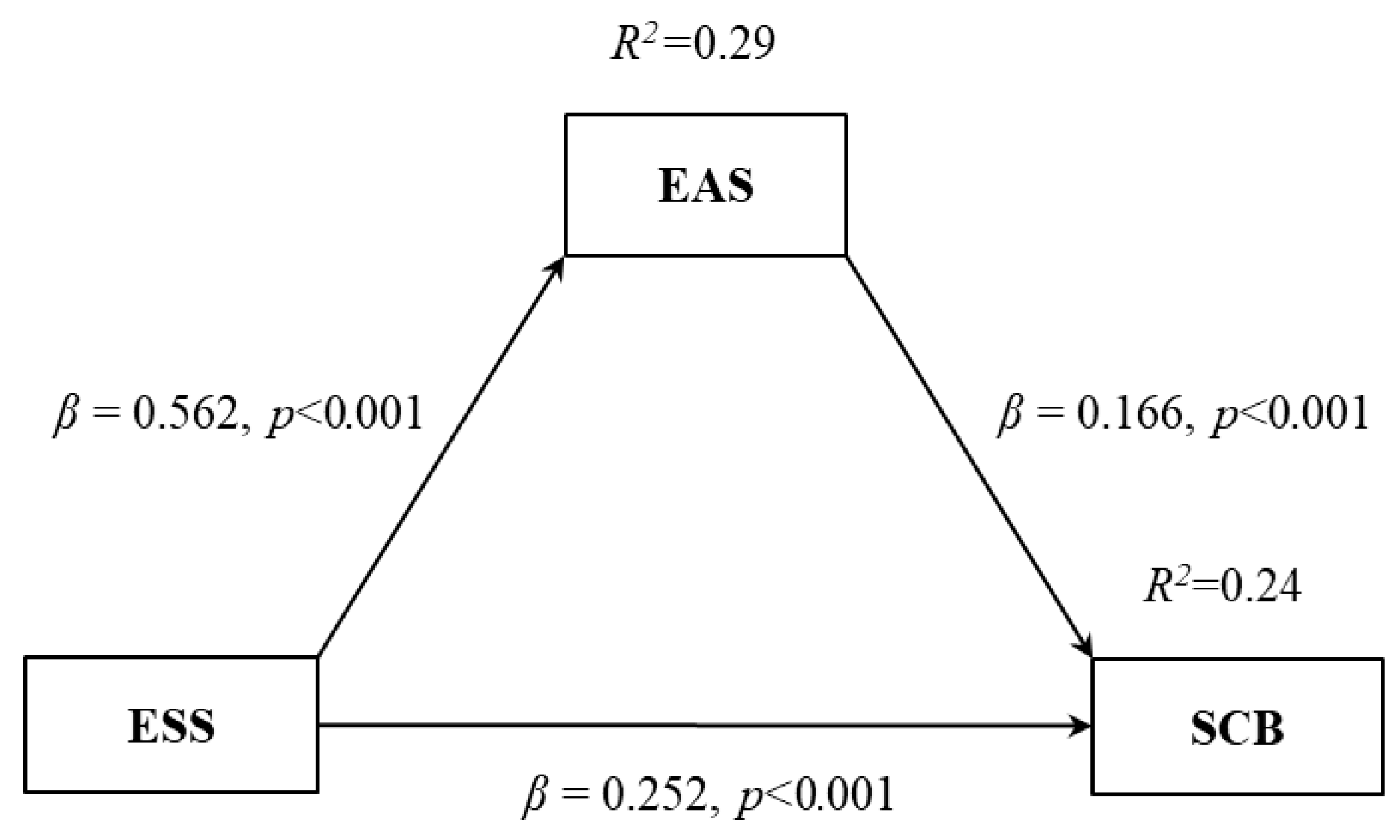 Figure 2 provides a visual representation of the direct and indirect relationships among the environmental sensitivity (ESS), eco-anxiety (EAS), and sustainable consumption behavior (SCB) scales. The explained variance values (R