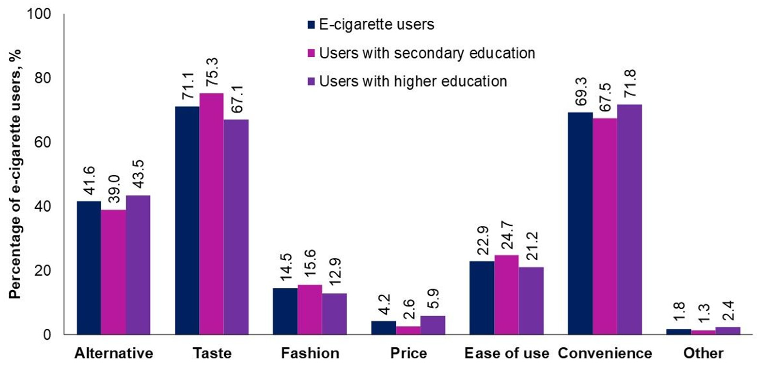 | Education level | Share of users with secondary/higher education aged 18–30 who smoke disposable e-cigarettes, % | ||||
