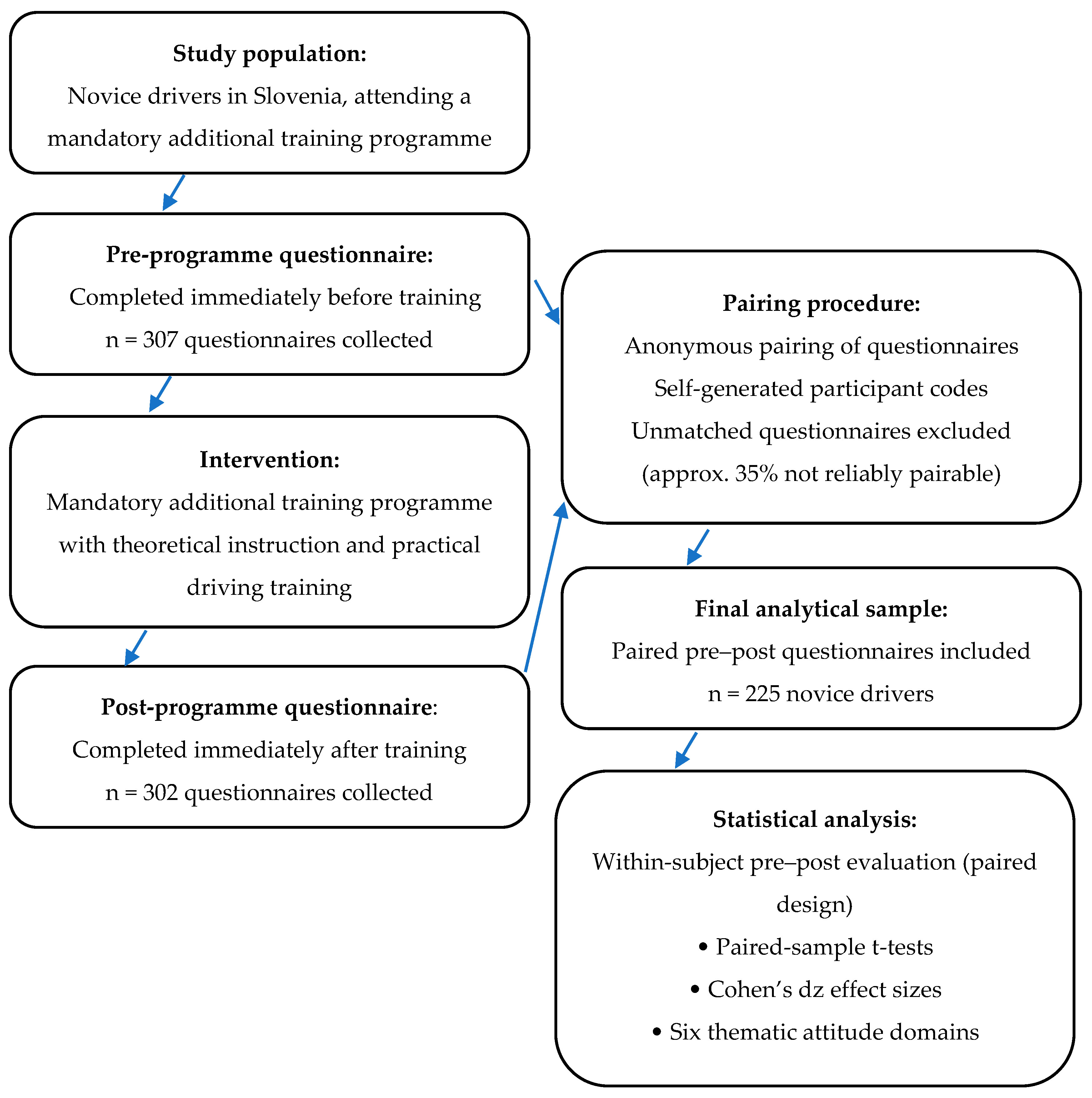 Taken together, prior research highlights persistent uncertainty regarding the effectiveness of driver education programmes, especially mandatory ones, and of the mechanisms through which educational programmes exert influence. Because theoretical models suggest that attitudes, perceived behavioural control, and risk perception serve as precursors to behavioural intention, studying short-term attitudinal change remains a meaningful and appropriate approach for evaluating the proximal effects of such programmes, even if behavioural outcomes are not immediately measurable. However, the lack of empirical evidence from compulsory, nationally enforced post-licensure programmes such as the one evaluated here is evident. Notably, limited research has methodically investigated these programmes in real-world contexts, despite their fundamental role in graduated licencing systems and their clear emphasis on risk awareness, self-reflection, and hazard anticipation. This study fills the gap by presenting a domain-specific evaluation of short-term attitudinal changes in Slovenia’s compulsory novice driver training programme. The study provides context-specific insights regarding the direction and extent of attitudinal calibration associated with programme participation, based on the Theory of Planned Behaviour and risk-calibration perspectives, rather than calculating causal or behavioural impacts. As such, it examines whether participation in the Slovenian additional training programme is associated with meaningful changes in attitudes linked to safe driving, such as compliance with traffic rules, distraction, risk perception, self-evaluation of driving skill, and acceptance of further training.