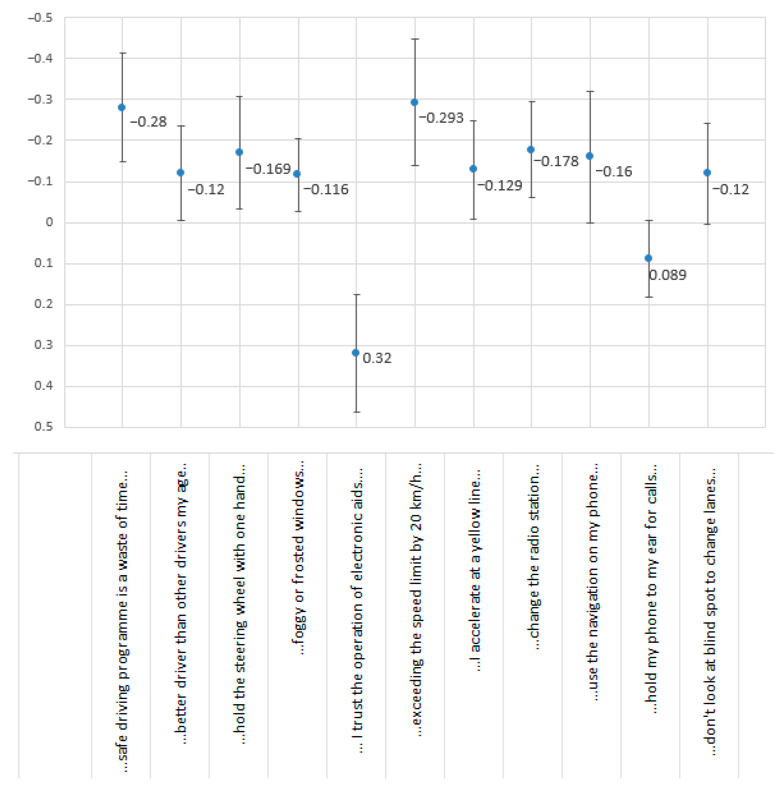 The direction of all significant changes indicated improved safety orientation, which is shown either through lower agreement with items describing unsafe attitudes or a more realistic self-assessment of their driving ability. The items were set in a way that they describe six thematic categories that reflect the conceptual structure of the questionnaire, and the results across the thematic categories are presented below.
