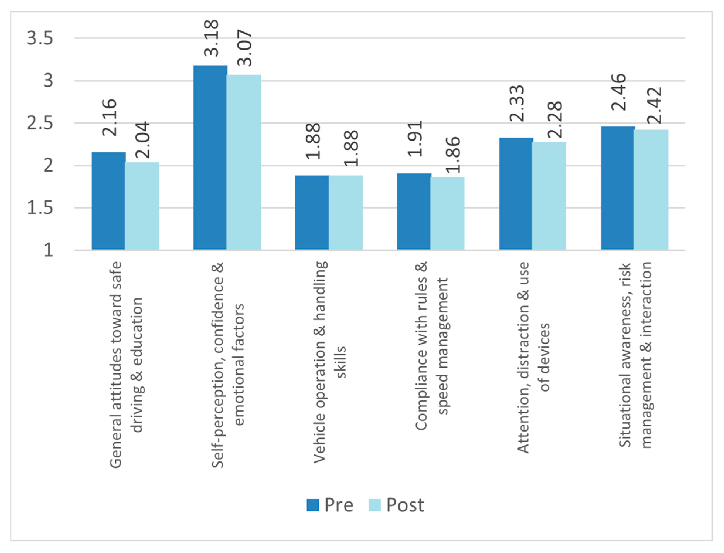 Figure 3 presents mean pre- and post-programme scores across the six thematic categories of safe-driving attitudes (see
