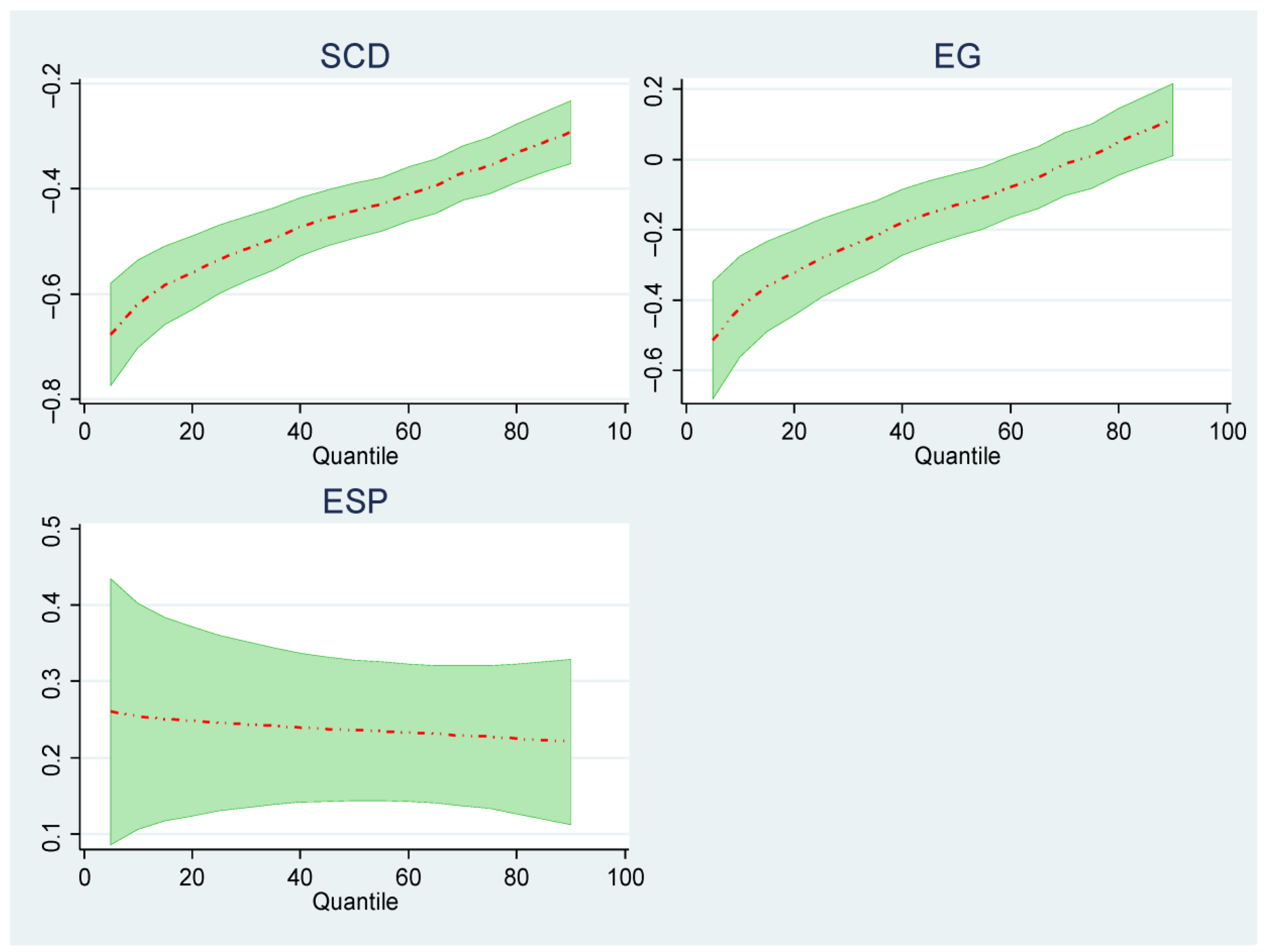 | EG | −0.137 * [−3.04] | 0.161 * [6.05] | −0.415 * [−5.87] | −0.318 * [−5.20] | −0.246 * [−4.59] | −0.178 * [−3.69] | −0.129 * [−2.84] | −0.077 *** [−1.73] | −0.013 [−0.29] | 0.046 [0.97] | 0.112 ** [2.14] |