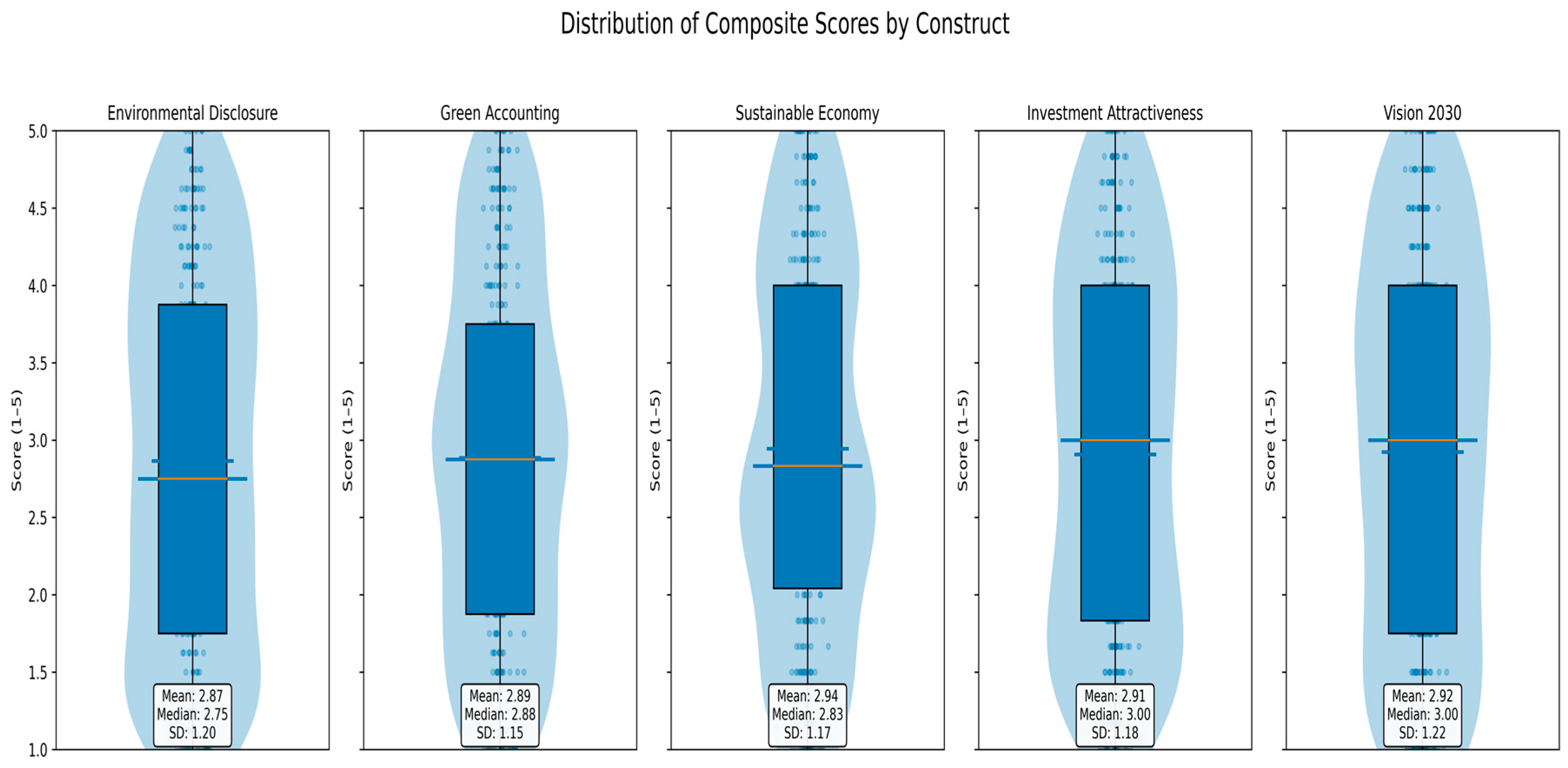 Figure 1 illustrates the distribution patterns using violin plots combined with box plots. The distributions appeared relatively symmetric for most constructs, with median values closely aligned with the mean. The wider portions of the violin plots around the 2–3 range indicate a concentration of responses in the lower-to-moderate range of the scale. This distributional pattern is consistent with the descriptive statistics and reinforces the conclusion that environmental practices are unevenly adopted across firms.