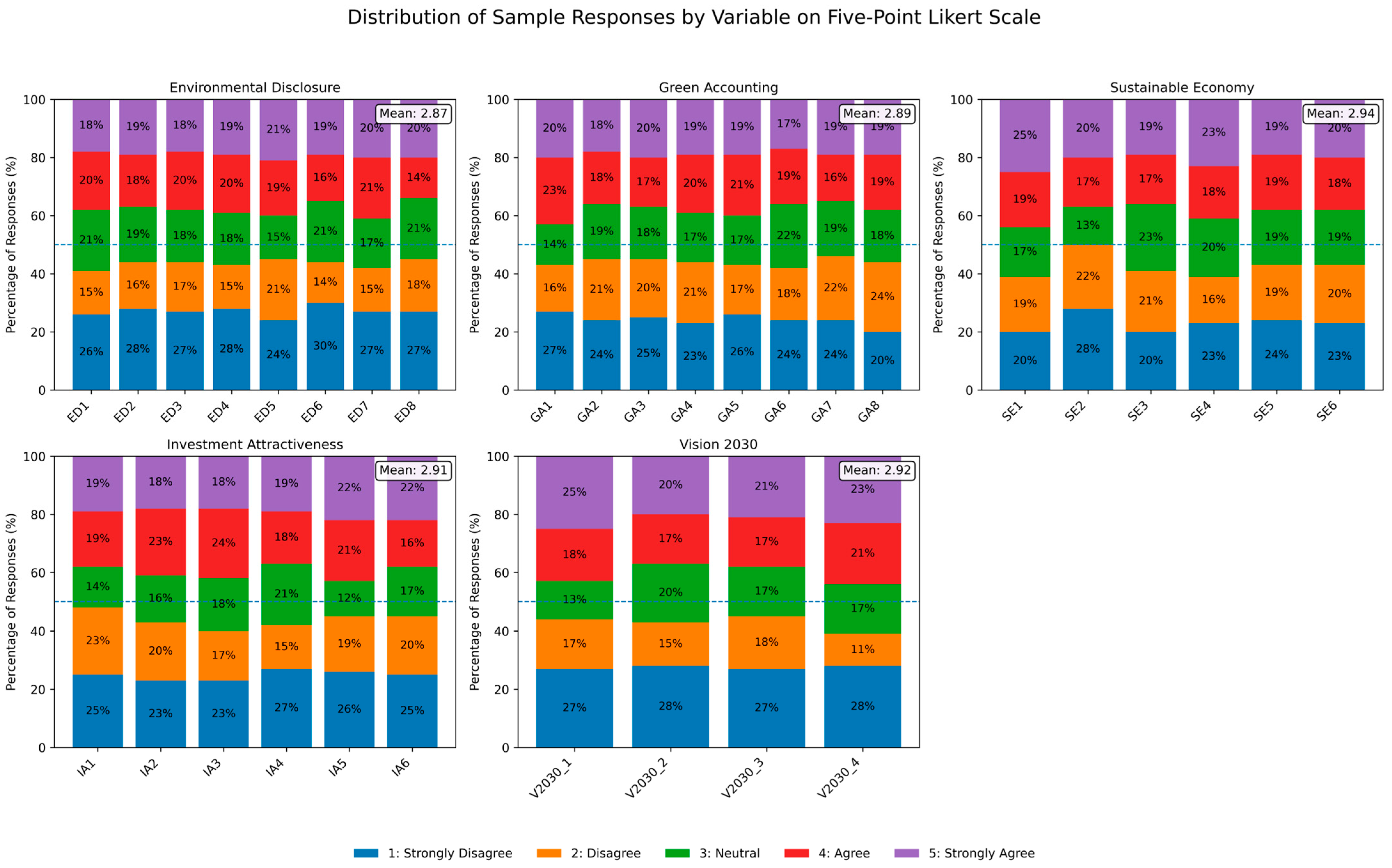 Figure 2 presents detailed item-level response distributions across the five-point Likert scale. The stacked bar charts show that negative evaluations—comprising strongly disagree and disagree responses—consistently account for approximately 40–55% of responses across most items. Neutral responses represent around 13–23%, while positive responses (agree and strongly agree) generally range between 30–45%. The dashed horizontal reference line highlights that mean item scores remain below the scale midpoint of 3.0 across all constructs, indicating moderate-to-low perceived implementation levels. Overall, the distributions suggest that although elements of environmental disclosure, green accounting, and sustainability-oriented practices are present among some firms, their adoption remains uneven and insufficiently institutionalized across the sample.