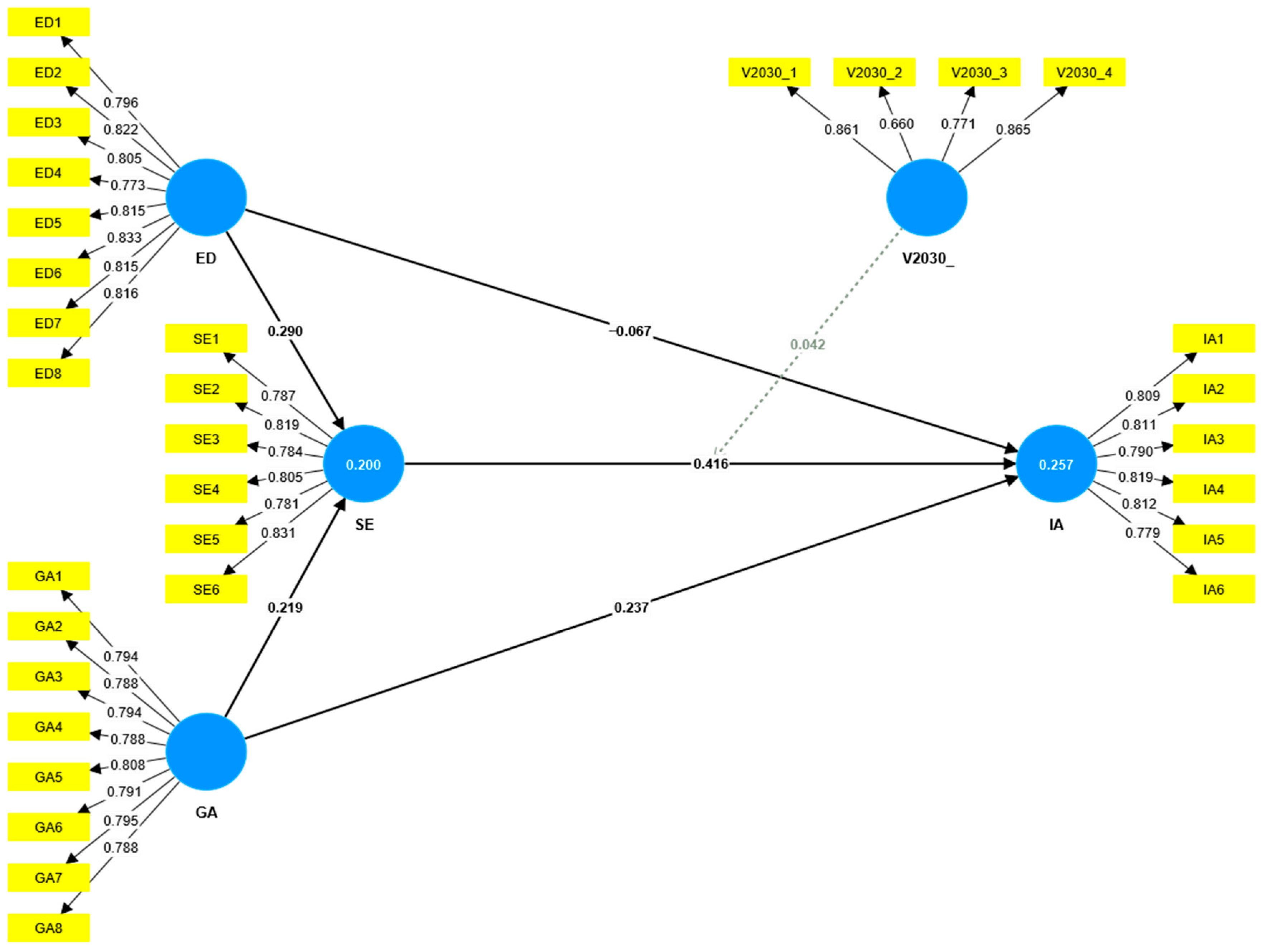 The moderating effect of Vision 2030 alignment on the relationship between sustainable economic outcomes and investment attractiveness is not statistically significant (β = 0.042, p = 0.498), leading to the rejection of H8. This result suggests that, within the present sample, alignment with the national sustainability strategy does not materially strengthen or weaken the sustainability–investment relationship.
