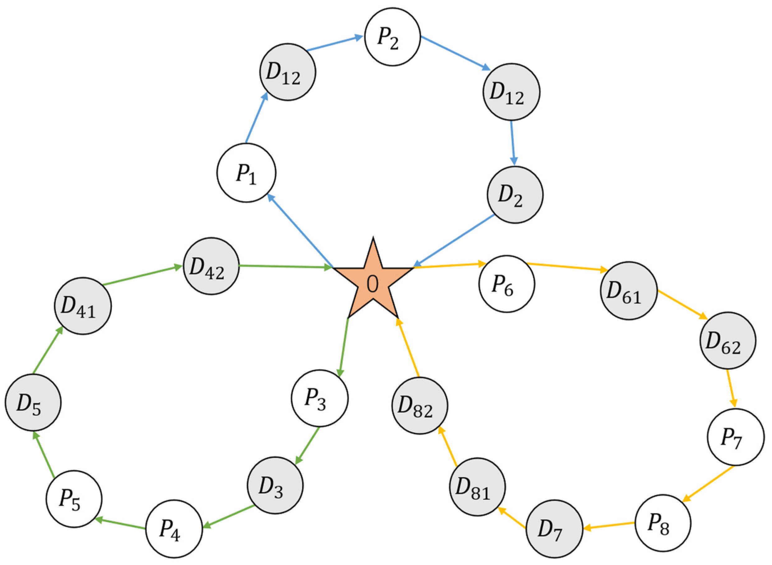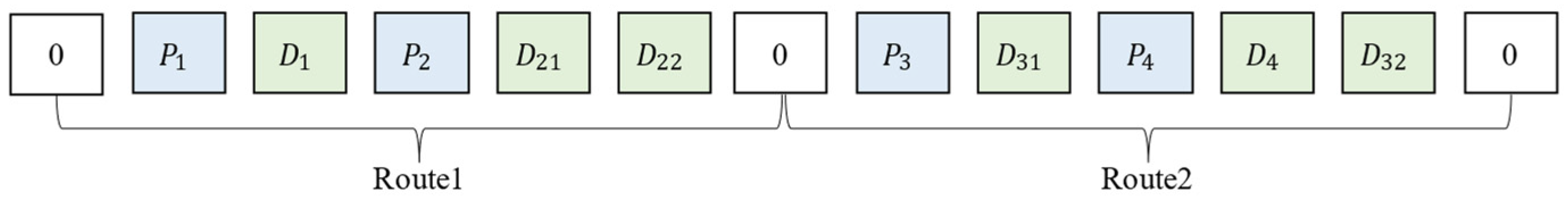 Figure 4, a single gene represents the complete travel route of a delivery vehicle, encoded so that the depot serves as both the starting and ending nodes, with visits to pickup nodes and their corresponding delivery nodes occurring sequentially. This coding approach inherently satisfies the constraint that pickup nodes must be visited before their corresponding delivery nodes.