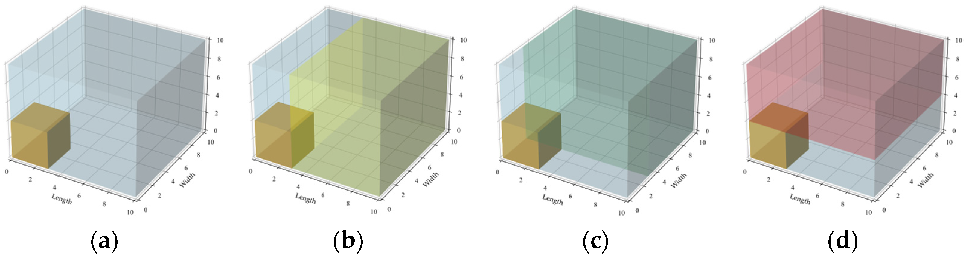 Figure 5. After placing a box, the algorithm generates new residual spaces in three orthogonal directions: rightward along the length, rearward along the width, and upward along the height. After partitioning, overlapping or adjacent spatial regions are automatically merged to reduce fragmentation and enhance space utilization.