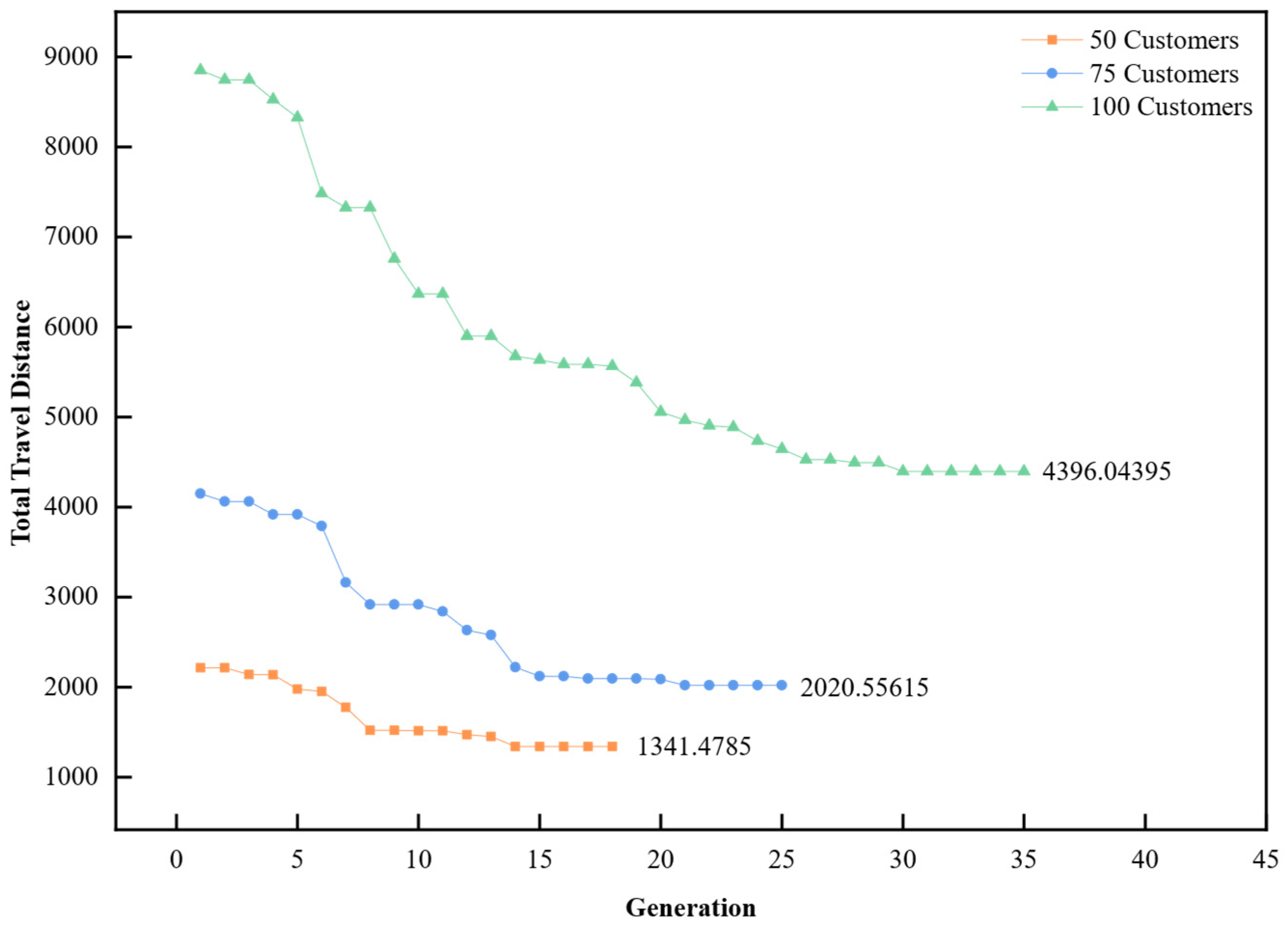 Flexible yet structured encoding: The grouping-based encoding and hybrid insertion strategy allow the algorithm to handle different numbers of vehicles and complex one-to-many pickup–delivery patterns while preserving precedence and capacity constraints.