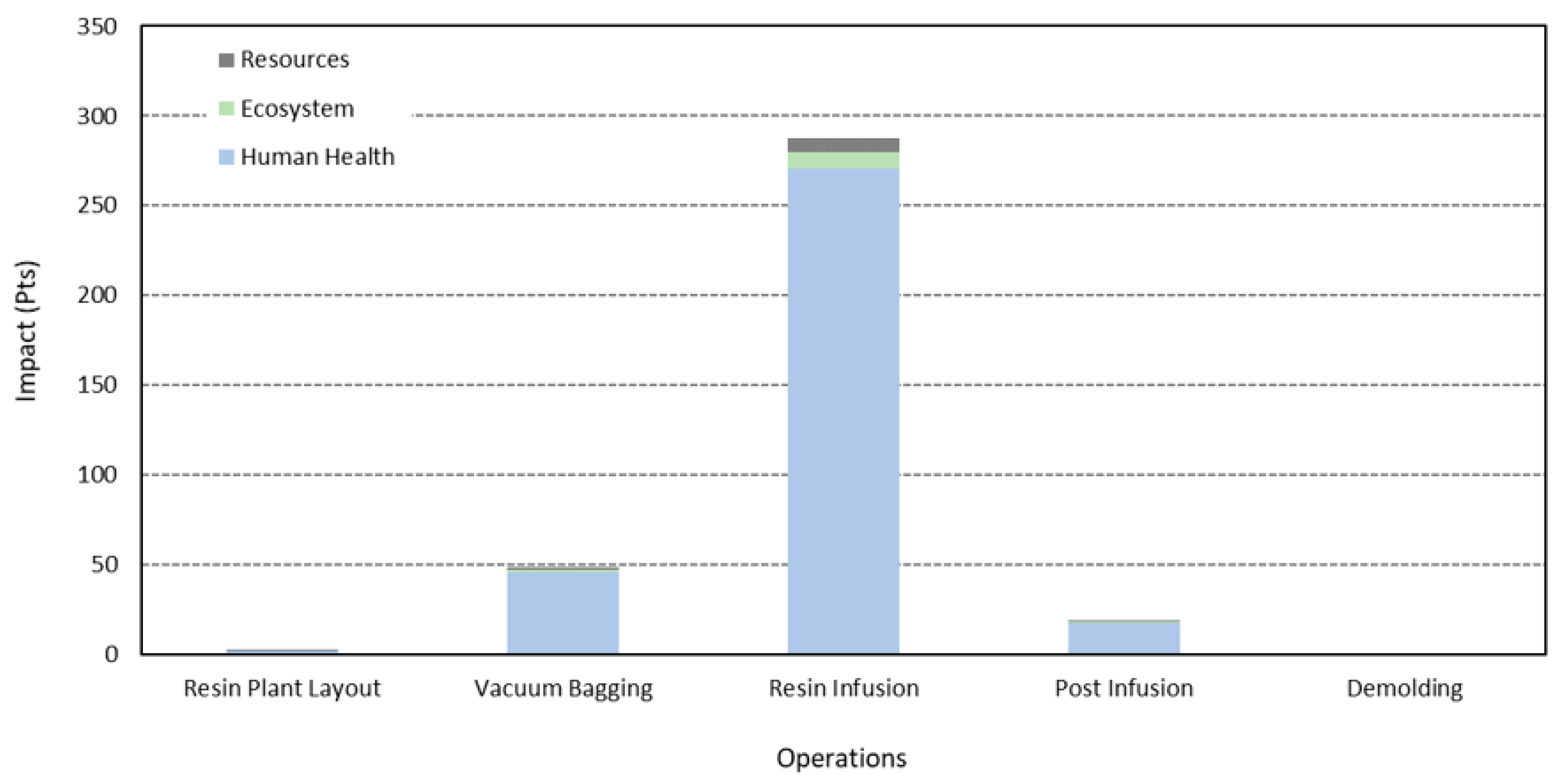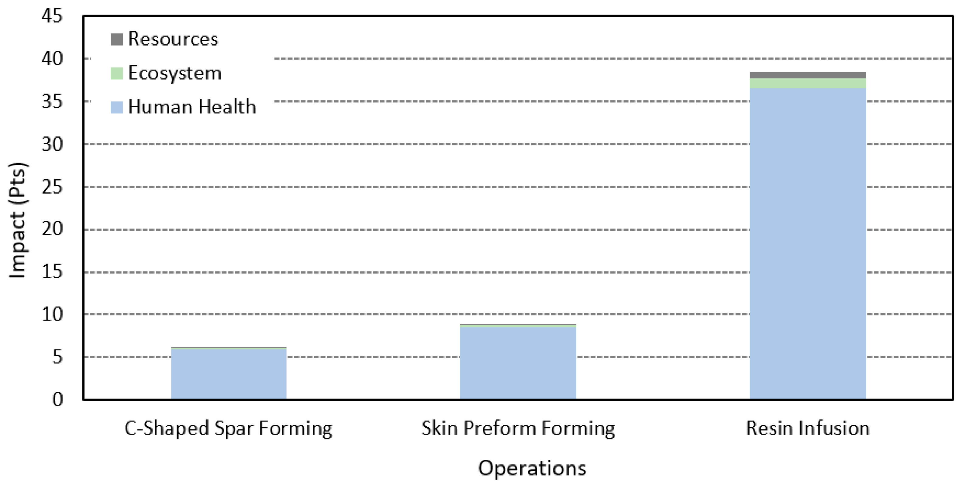 Figure 6, presented on an ecopoint (Pt) scale reflecting the damage caused by resource usage. The results reveal that the resin infusion phase accounts for the majority of the environmental impacts, followed by the skin preform forming phase. Together, these two operations represent approximately 88% of the total impacts, which is consistent with the relatively low resource and energy usage during the C-shaped-spar forming phase. Human health emerged as the most critical concern, primarily due to the risks faced by workers during manufacturing. These risks are linked to exposure, inhalation, and direct contact with hazardous compounds, which can lead to respiratory issues and long-term health effects.