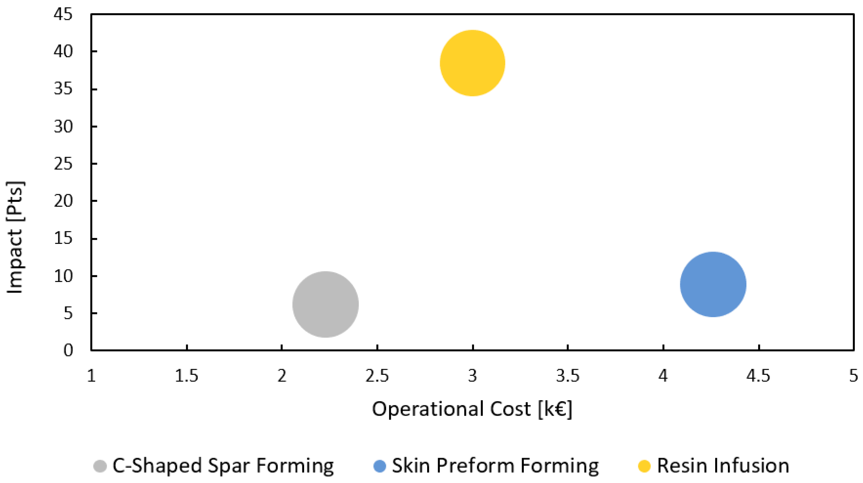 The analysis of the chart reveals distinct trends in the environmental and operational cost impacts of the manufacturing operations. The C-shaped-spar-forming phase shows the lowest combined impact and cost, whereas resin infusion has the highest environmental impact, and skin preform forming incurs the highest operational costs. These findings highlight the need to closely examine process variables that significantly influence these outcomes.