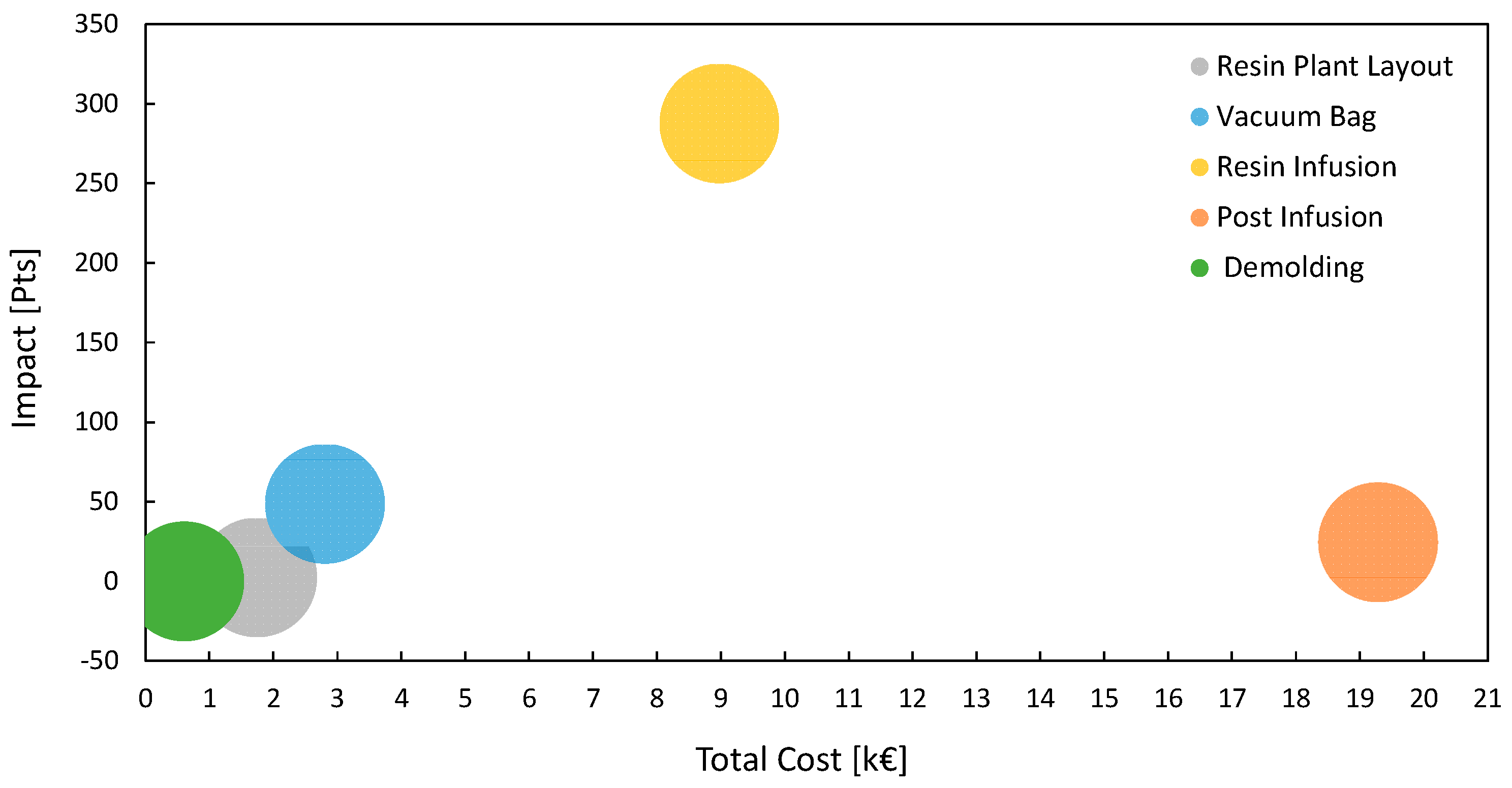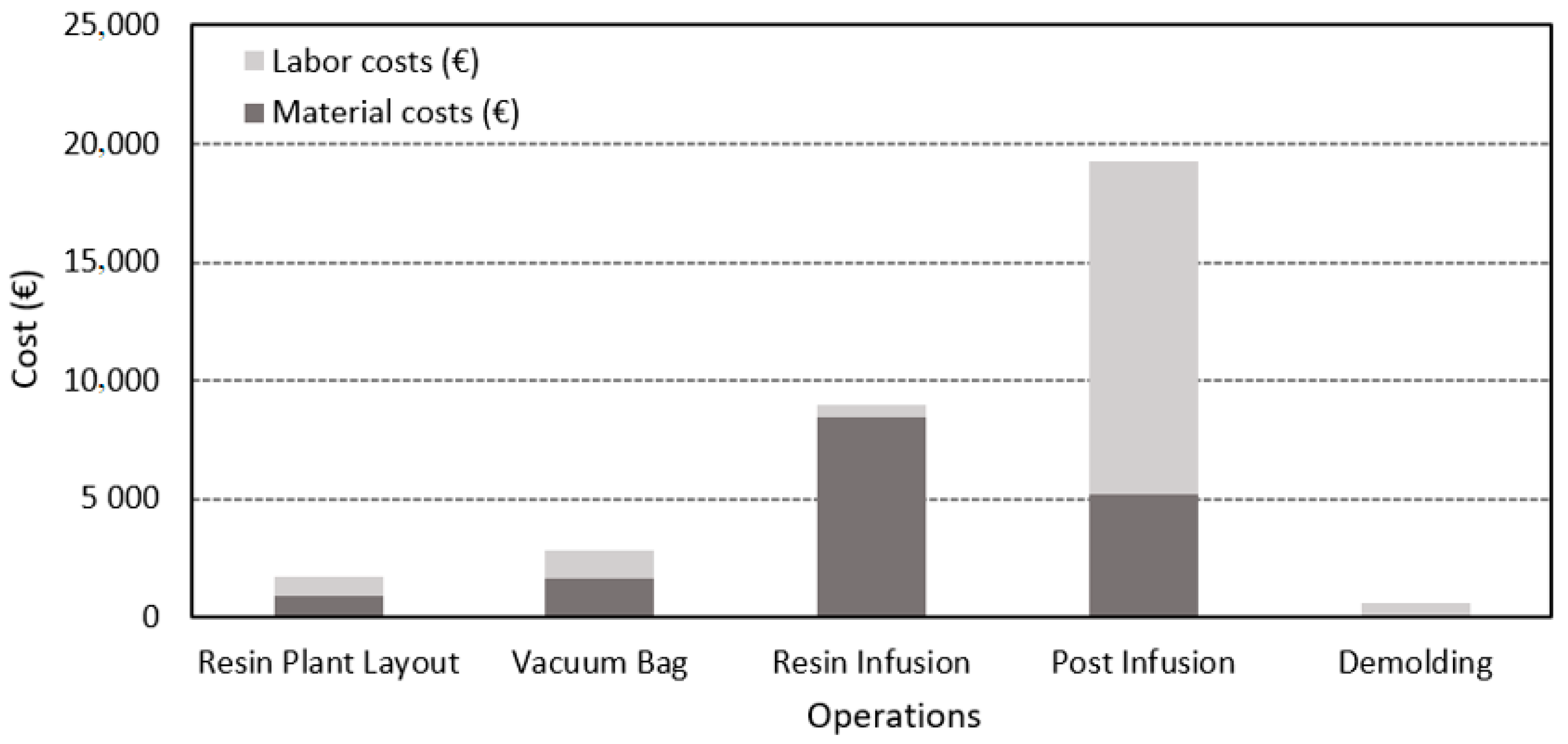 A detailed assessment of the Post-Infusion phase is essential to identify any inefficiencies that may be extending labor time and driving up costs, or to integrate technologies and methods that support operators in their manual activities. Additionally, resin infusion stands out as having the highest material costs. Monitoring this process closely and implementing strategies to minimize material waste are critical steps to enhance efficiency and reduce overall expenses.