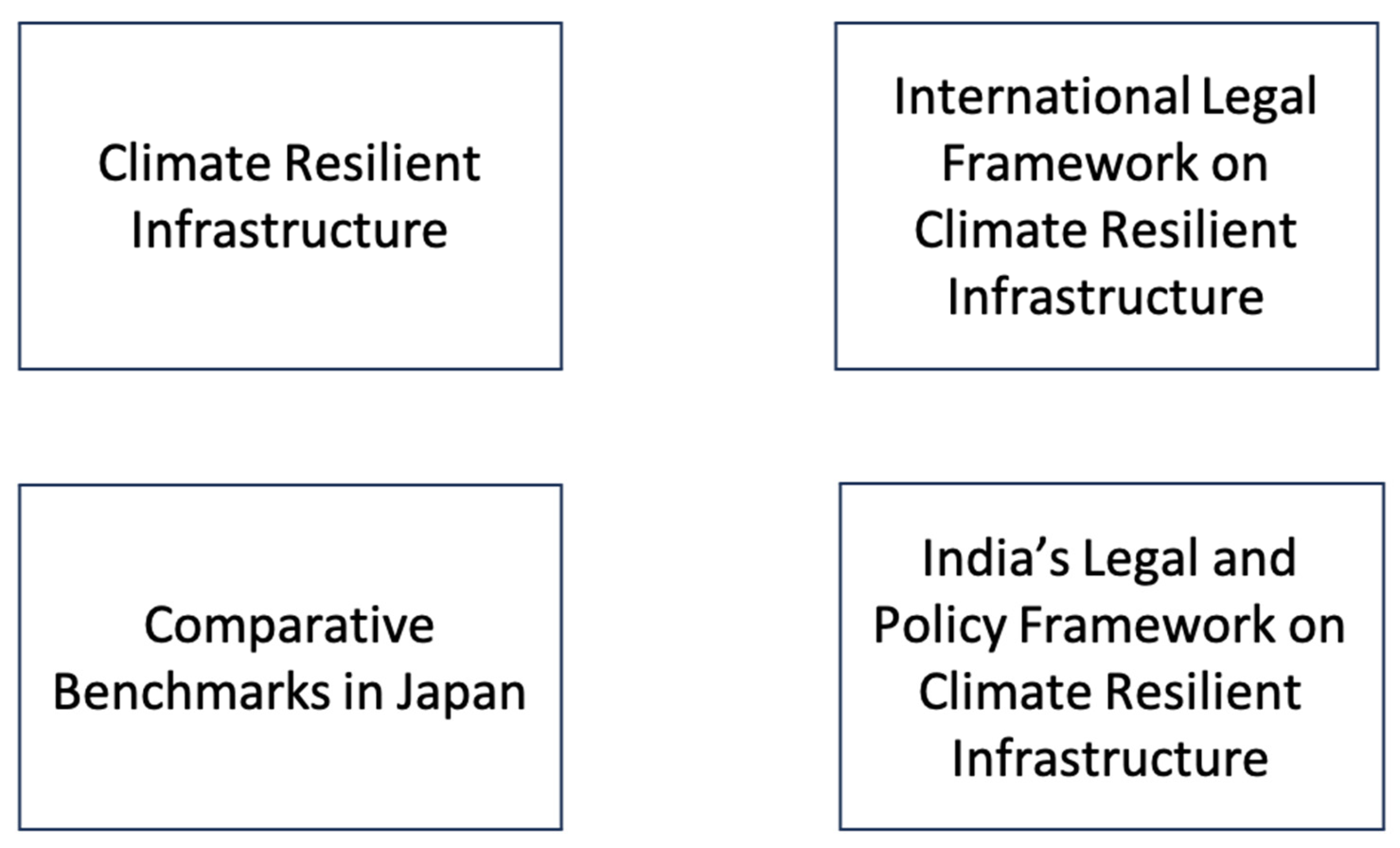 Figure 2 broadly outlines the key concepts that were analysed in this study: (i) climate-resilient infrastructure, (ii) international legal frameworks that integrate climate risk into infrastructure planning, (iii) best practices from the frameworks in Japan, and (iv) an evaluation of the Indian legal and policy framework.