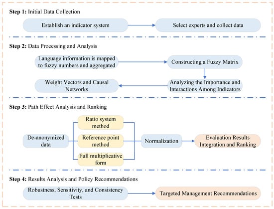 To facilitate reader comprehension, the specific logic of this study is illustrated in Figure 1. This logic diagram depicts the integrated methodology flow adopted in this study. It outlines the sequential process from indicator system development and expert-inspired insights to fuzzy information transformation and causal structure analysis. It further illustrates the multi-method synthesis employed for scenario evaluation, along with complementary consistency, stability, and sensitivity checks to ensure result reliability. The framework ultimately derives final rankings and formulates targeted management and policy insights.