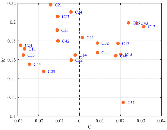 By defuzzifying the crisp-value matrix , one can compute the direct and indirect influences among indicators, yielding the total impact matrix , as shown in Table A5. This matrix contains the comprehensive impacts for each considered indicator: