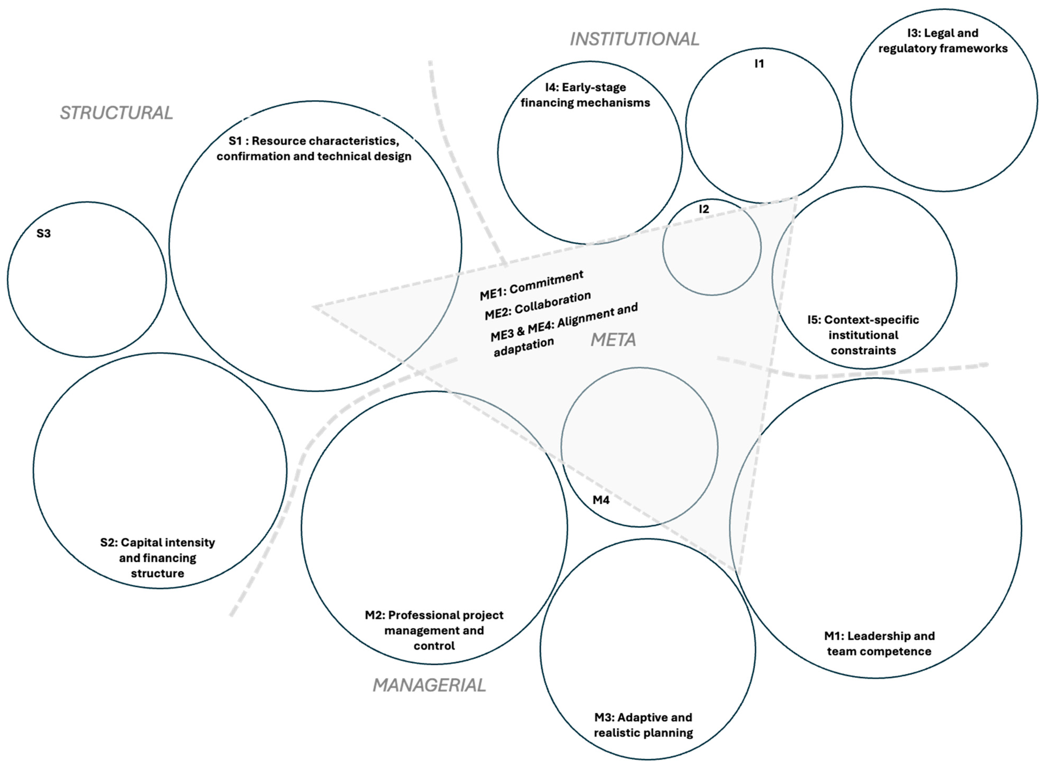 The analysis reveals a relatively balanced pattern, with Managerial conditions accounting for 32 per cent of all coded statements, Institutional conditions at 25 per cent, Structural conditions at 24 per cent, and Meta-conditions at 19 per cent. Within the domains, several sub-categories stand out for their frequency and interpretive importance. The most frequently referenced was Resource characteristics, confirmation and technical design (24 counts), followed by M1—Leadership and team competence (22 counts), M2—Professional project management and control (21), ME1—Commitment (17 counts), S2—Capital intensity and financing structure (14), and ME2—Collaboration (12). Other frequently mentioned sub-categories are I5—Context-specific institutional constraints (12), I4—Early financing mechanisms (12), I3—Legal and regulatory frameworks (11), Adaptive and realistic planning (11), M4—Stakeholder engagement and external coordination (8), ME3—Alignment and adaption (8) and S3—Context driven success criteria (7).