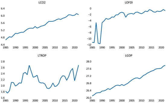 From Table 2, it is evident that the highest mean and median values can be seen in the LGDP variable, with the values 26.93181 and 26.85473, respectively. The next, in terms of high values, is LCO2. This pattern is also observed in the maximum and minimum values. For skewness, LCO2 and LOFDI are skewed negatively at −0.149534 and −2.036834, respectively, while LTROP and LGDP are skewed positively at 0.317885 and 0.164348, respectively. LCO2, LTROP, and LGDP are platykurtic because the kurtosis values are below 3, while LOFDI is leptokurtic because the value is above 3. Aside from LOFDI, which demonstrates a non-normal distribution nature, every other variable displays normal distribution. The trends and patterns of the variables are presented in Figure 1. LCO2 and LGDP evidently moved in an upward trend, while fluctuations are observed in LOFDI and LTROP.