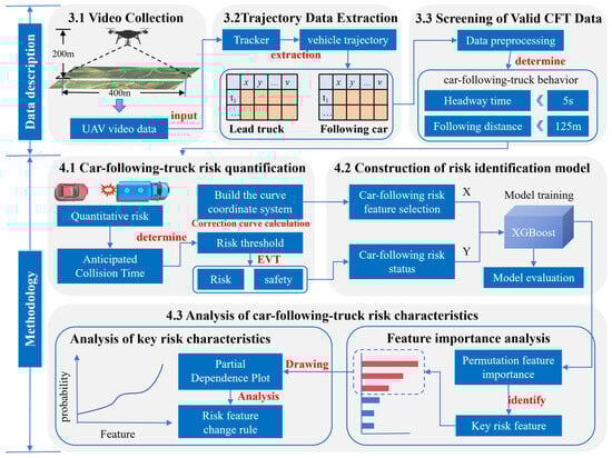Addressing the limitations of previous studies on mountain road risks, this research aims to construct an analytical framework capable of revealing the evolution process of CFT risks based on high-resolution micro-trajectory data. This framework will support road safety assessments in intelligent connected vehicle environments. First, this study collects drone aerial videos from actual mountain roads, extracts vehicle trajectory data containing high-frequency dynamic parameters such as speed and acceleration, and constructs two typical CFT scenarios: straight sections and curves. Second, a quantitative method for CFT risk is established using the two-dimensional alternative safety indicator ACT. EVT is employed to calibrate scenario-specific risk thresholds applicable to straight and curved road segments, ensuring risk classification better aligns with the actual operational characteristics of mountain roads. Furthermore, a machine learning recognition model based on XGBoost was developed. From a vehicle dynamics perspective, this model systematically analyzed the characteristic patterns of risk states under truck obstruction. By integrating feature importance and partial dependency graphs, it provided an in-depth analysis of risk evolution characteristics across dimensions, including the following: distance, speed difference, acceleration difference, and lateral maneuvering.