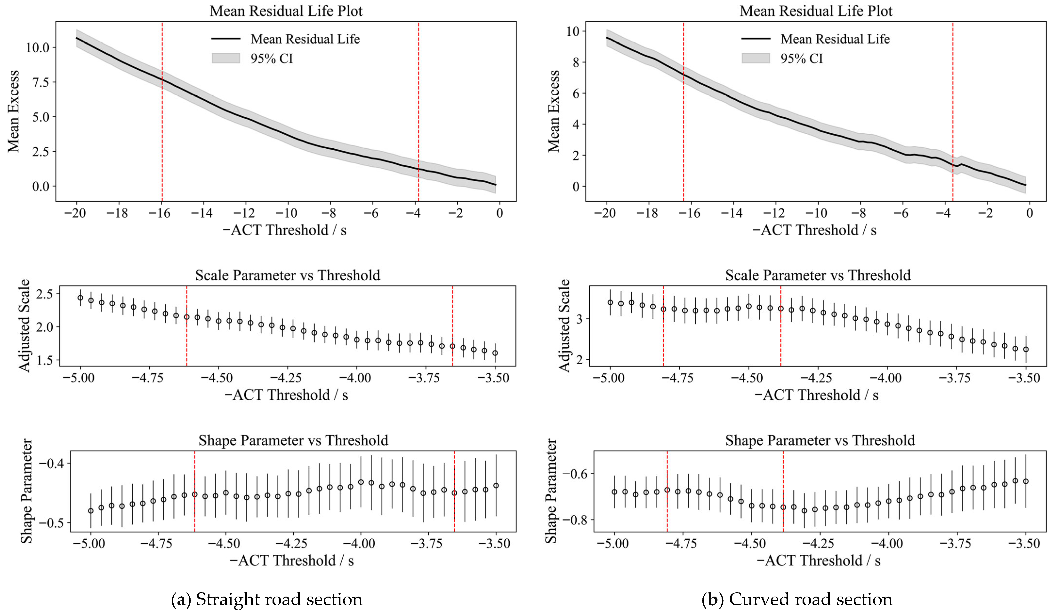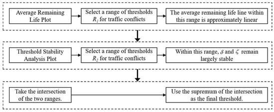 The basic steps of the graphical method in EVT are as follows: (1) Calculate the remaining life of the sample data, i.e., the expected value of E ( X u | X > u ) , plot the average remaining life curve of the sample data, and then determine a range R 1 where the average remaining life exhibits linear variation. (2) Plot the modified scale parameter and shape parameter as functions of the threshold. Subsequently, determine a range R 2 where the modified scale parameter and shape parameter remain essentially unchanged with respect to the threshold. (3) Take the intersection R = R 1 R 2 of ranges R 2 and R 2 , and use the upper bound u + of set R as the final threshold. The overall process is shown in Figure 5. It should be noted that the EVT-calibrated ACT thresholds are statistical classification boundaries rather than behavioral or operational safety limits. The resulting “high-risk” and “safe” states are model-internal and context-dependent, intended for relative risk stratification and subsequent analysis rather than normative safety assessment.