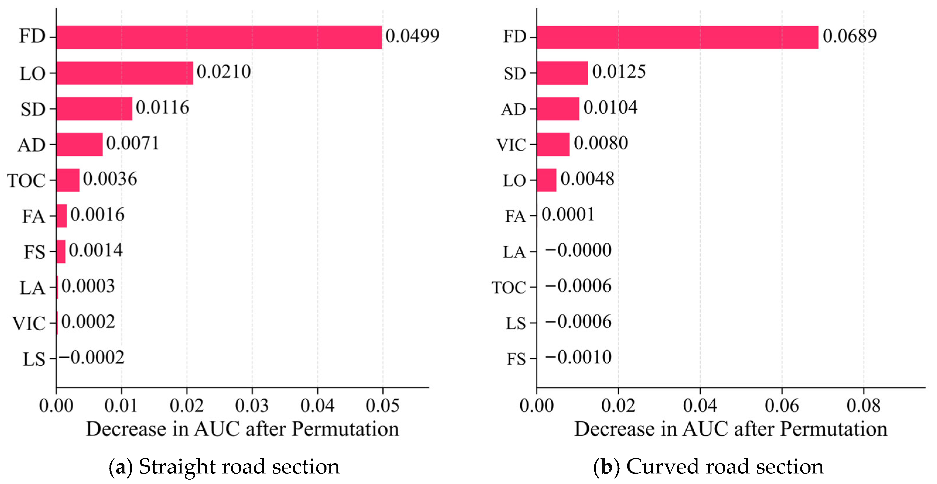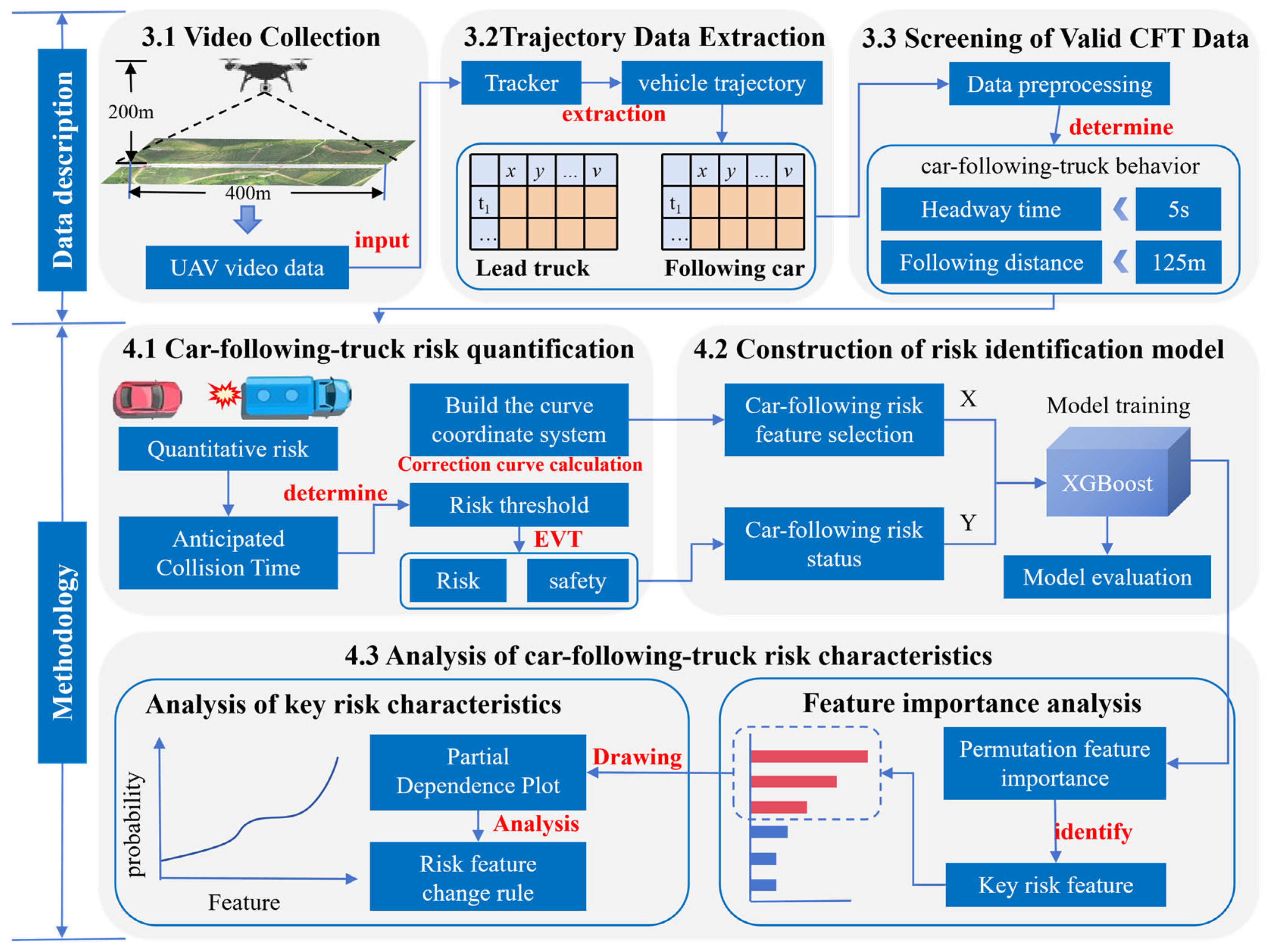 In the research methodology section, first, ACT, characterized by two-dimensional motion attributes and acceleration properties, is introduced as a quantitative indicator for CFT risk. A Frenet coordinate system is established to calibrate the calculation of risk and feature indicators in curved road scenarios. Subsequently, based on EVT, ACT danger thresholds are calibrated for straight and curved road sections, respectively. Subsequently, based on scenario-specific thresholds, the following states are categorized into safe and risky classes. Vehicle dynamics features are selected to build an XGBoost following a risk recognition model, whose performance is evaluated against multiple benchmark models. Finally, integrating AUC-based feature importance and Partial Dependency Plots (PDP), this study systematically analyzes the following risk characteristics from a vehicle dynamics perspective under truck-obscured conditions. It identifies differentiated risk control priorities for straight and curved road segments, providing support for safety management and driver assistance system design on mountainous two-lane roads.