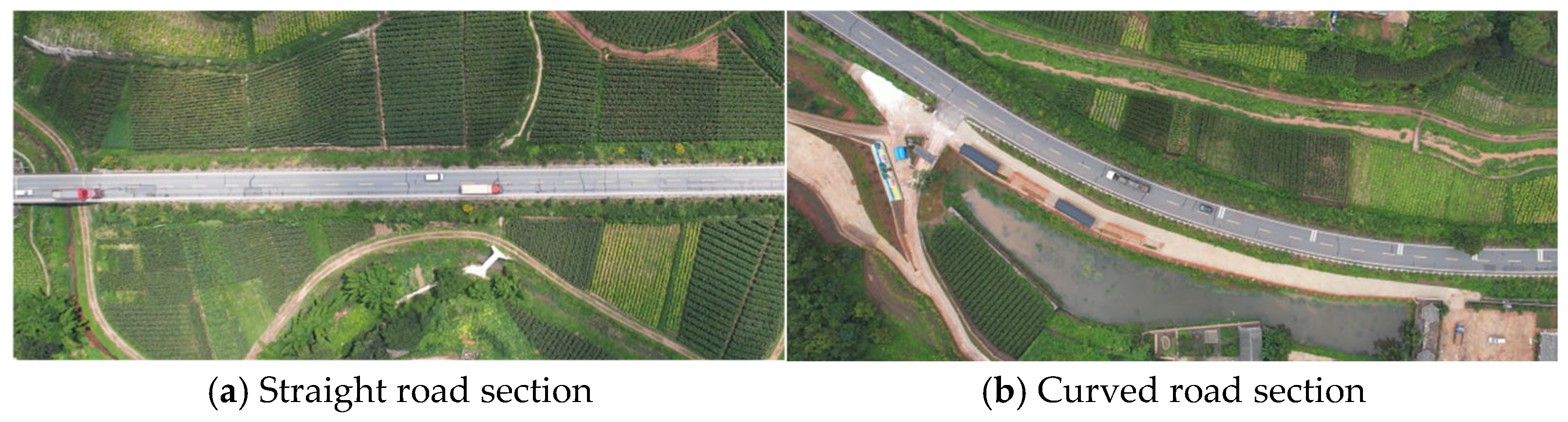 A typical mountainous two-lane road in Yunnan, China, was selected for study. This secondary road has a design speed of 60 km/h, with a single-lane width of 3.75 m. The inner side of curves features widened sections, with a width of 3.9 m on curved segments. The study section selected for this research is shown in Figure 2, comprising a straight section and a curved section.