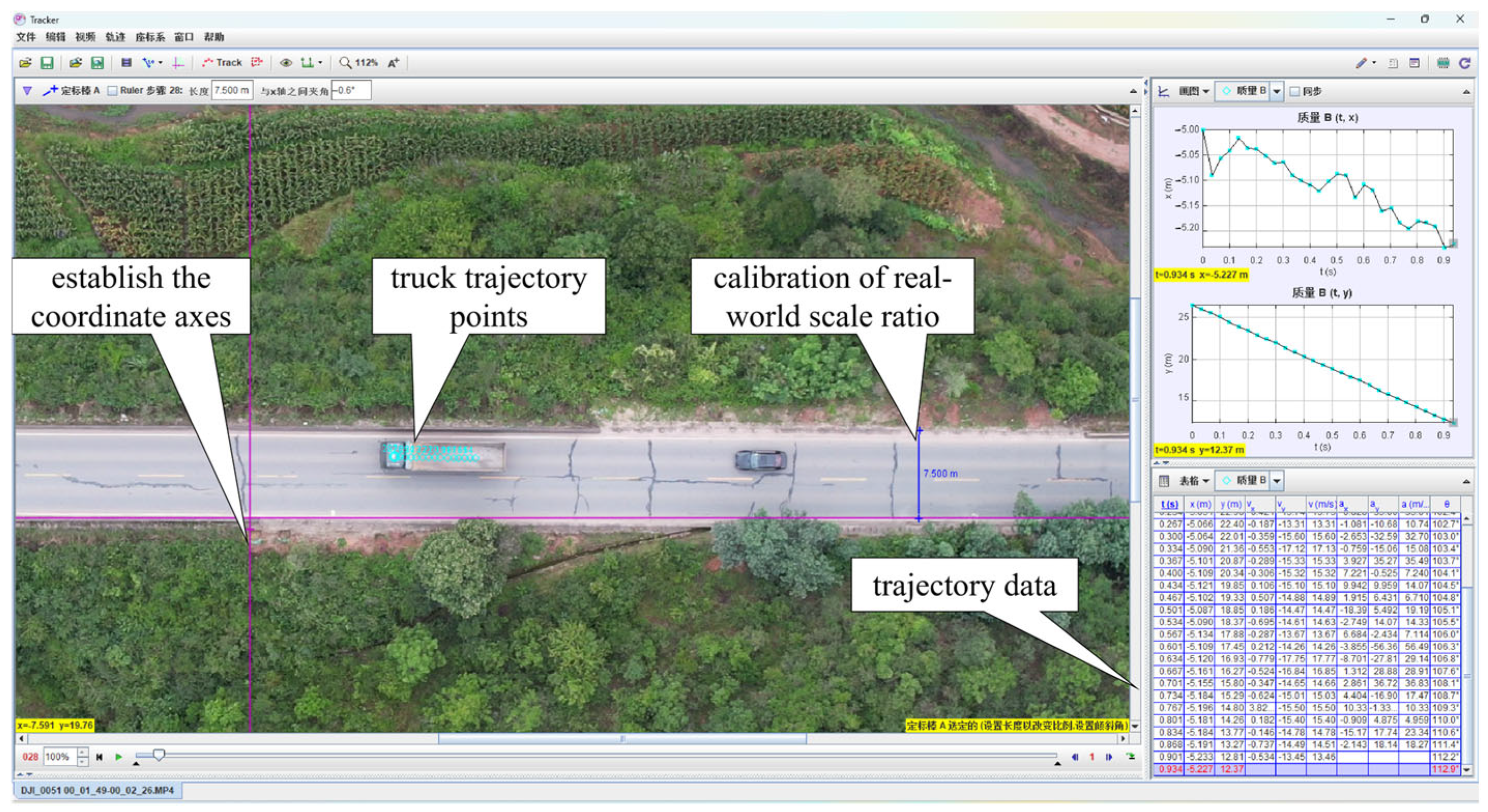 This paper utilizes the video analysis modeling tool Tracker to extract vehicle trajectory data. Tracker is an open-source video analysis and modeling tool built on the Open Source Physics (OSP) Java framework. Primarily designed for physics education, it has increasingly been applied to vehicle trajectory analysis in recent years. Tracker enables users to analyze object motion through video footage, automatically tracking specific targets within videos and capturing data such as their position, velocity, and acceleration, as shown in Figure 4. The specific steps for extracting vehicle trajectories using Tracker are as follows: