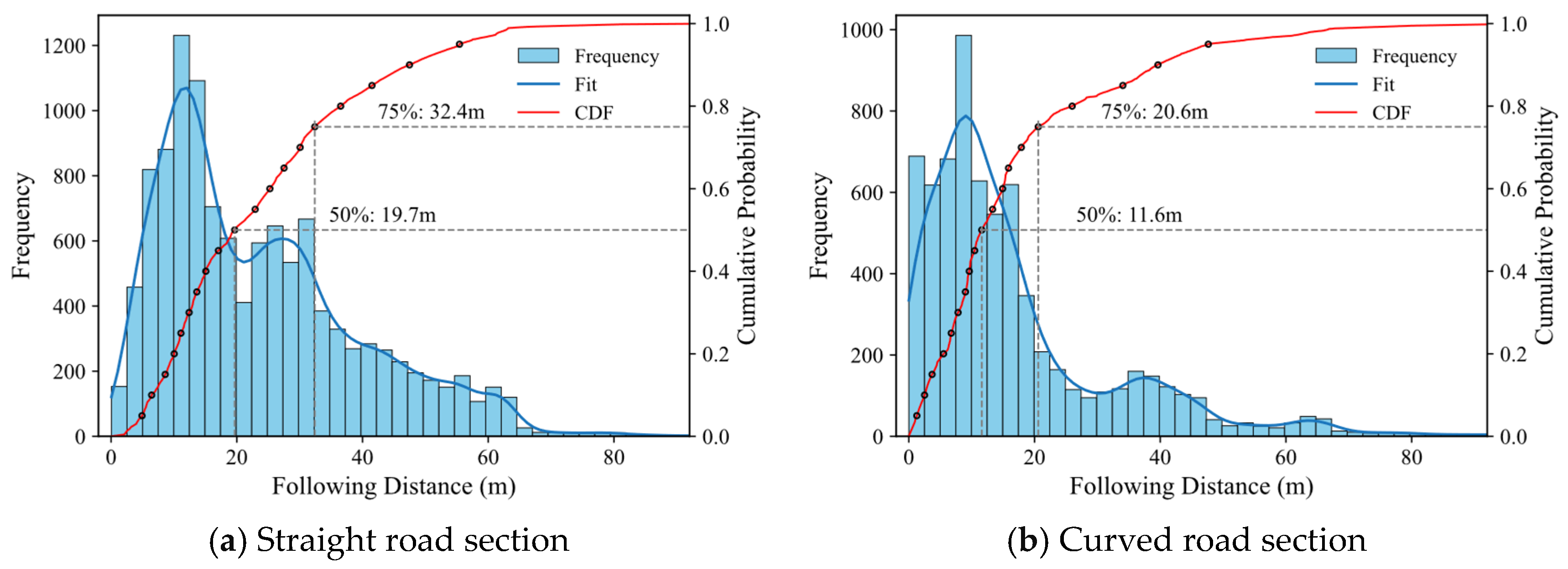 First, this study performs preprocessing operations on the extracted trajectory data, including data smoothing, missing value handling, and outlier detection. Subsequently, screening of valid CFT data, the criteria for defining CFT behavior are typically categorized into spatial and temporal aspects. For instance, traffic flow theory defines car following as the distance between the target vehicle and the preceding vehicle being less than 125 m. Additionally, some scholars propose that when the Time Headway (TH) between the target vehicle and the preceding vehicle is less than 5 s, it can be considered a car following state [7]. The U.S. Manual on Highway Capacity [42] explicitly states that TH can serve as a criterion for car following in two-lane highway scenarios. Integrating existing standards with road characteristics, this study adopts a CFT threshold of less than 5 s TH and less than 125 m following distance. Following the aforementioned steps, this study extracted a total of 571 CFT trajectory sets, including 366 sets on straight sections and 205 sets on curved sections, encompassing 88,354 trajectory pairs.