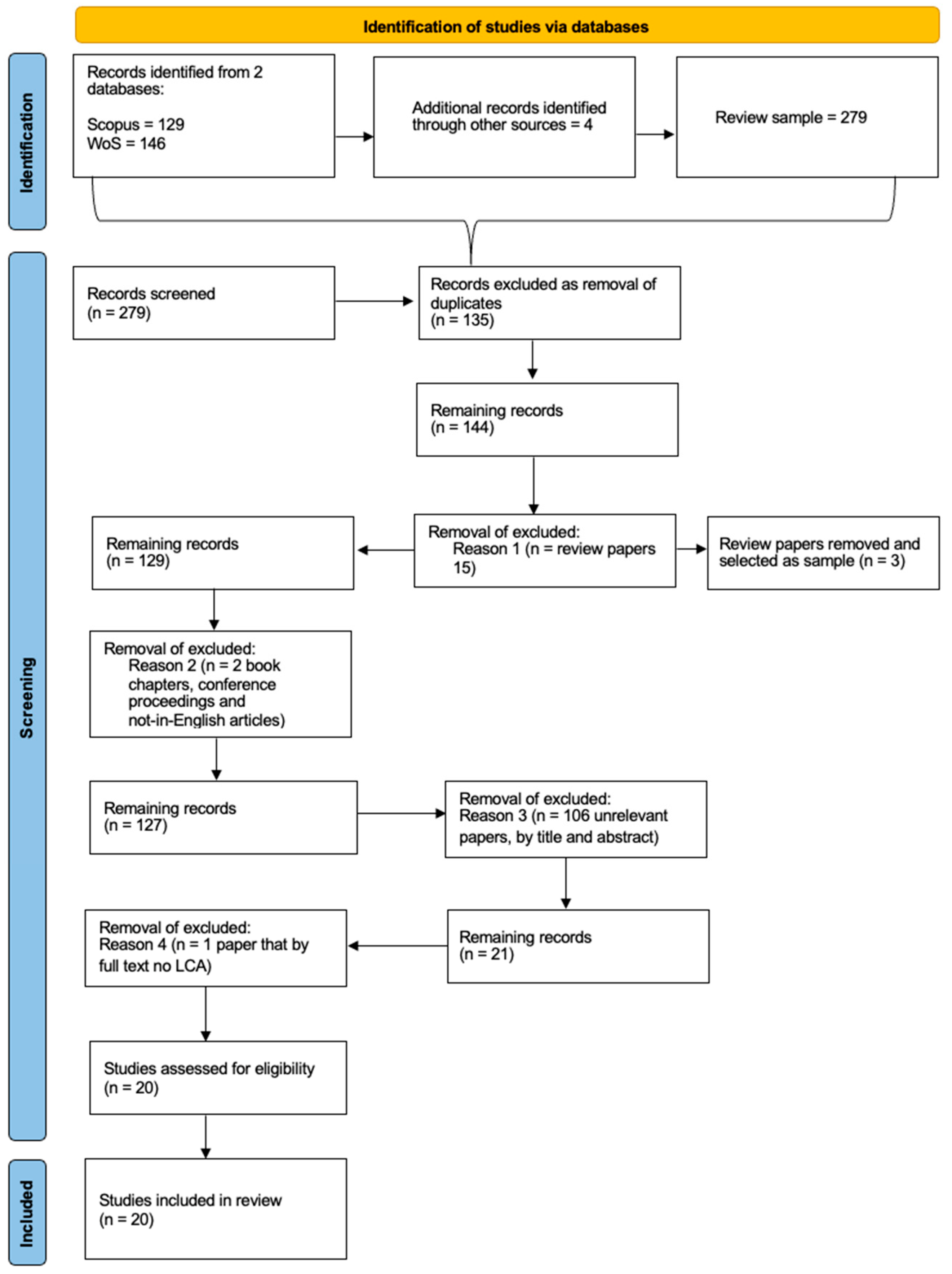 - The results of Zingale et al. [4] were found following the SLR methodology and the PRISMA model but only with regard to the DW sector. The same review has been adopted as a reference point for the topic of DW in this paper. Therefore, 14 articles, analyzed by Zingale et al. [4] (see Table S1 in Supplementary Materials), were excluded from the sample to avoid duplication of previously conducted analyses. Nevertheless, their review served as a starting point and reference for the present study.